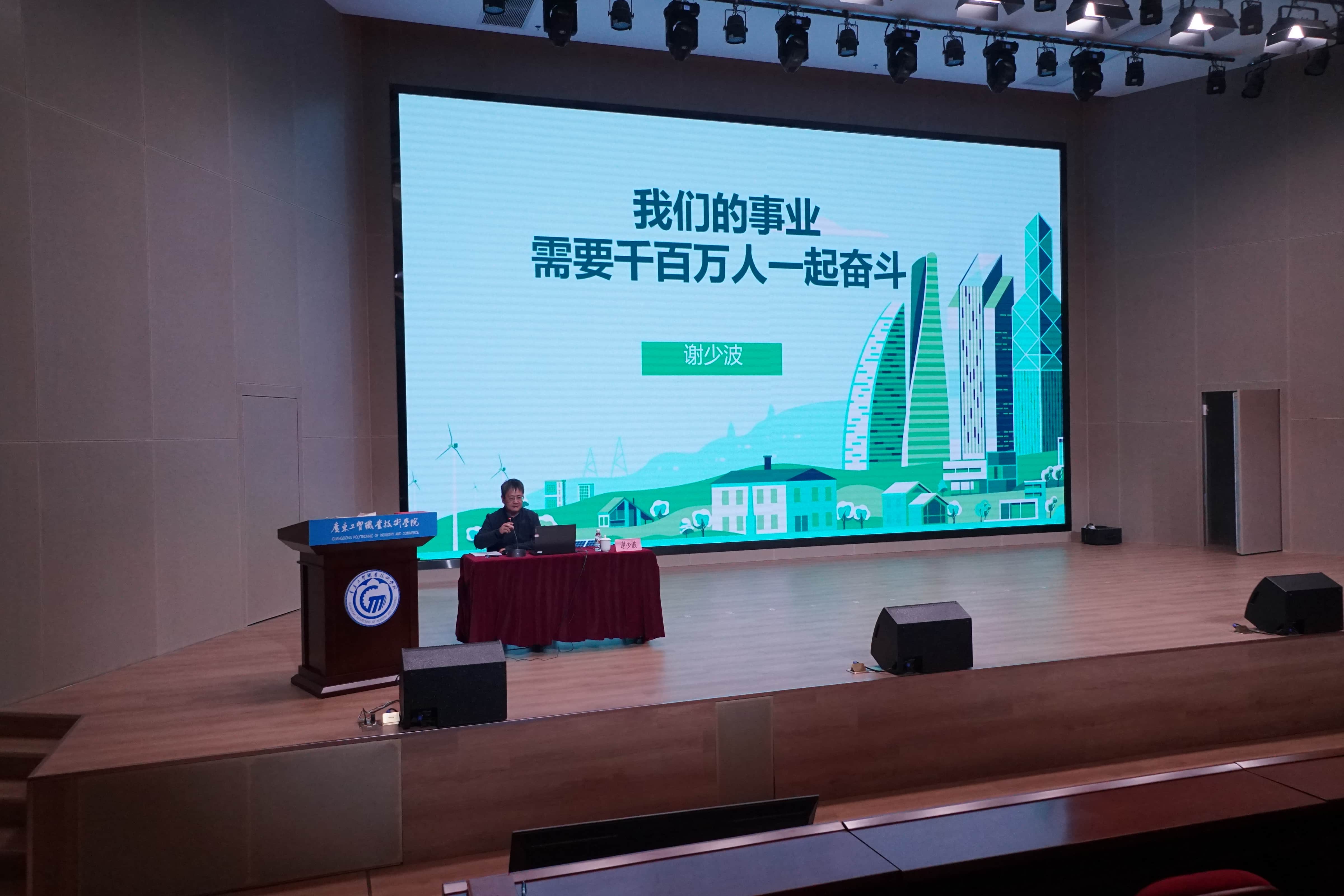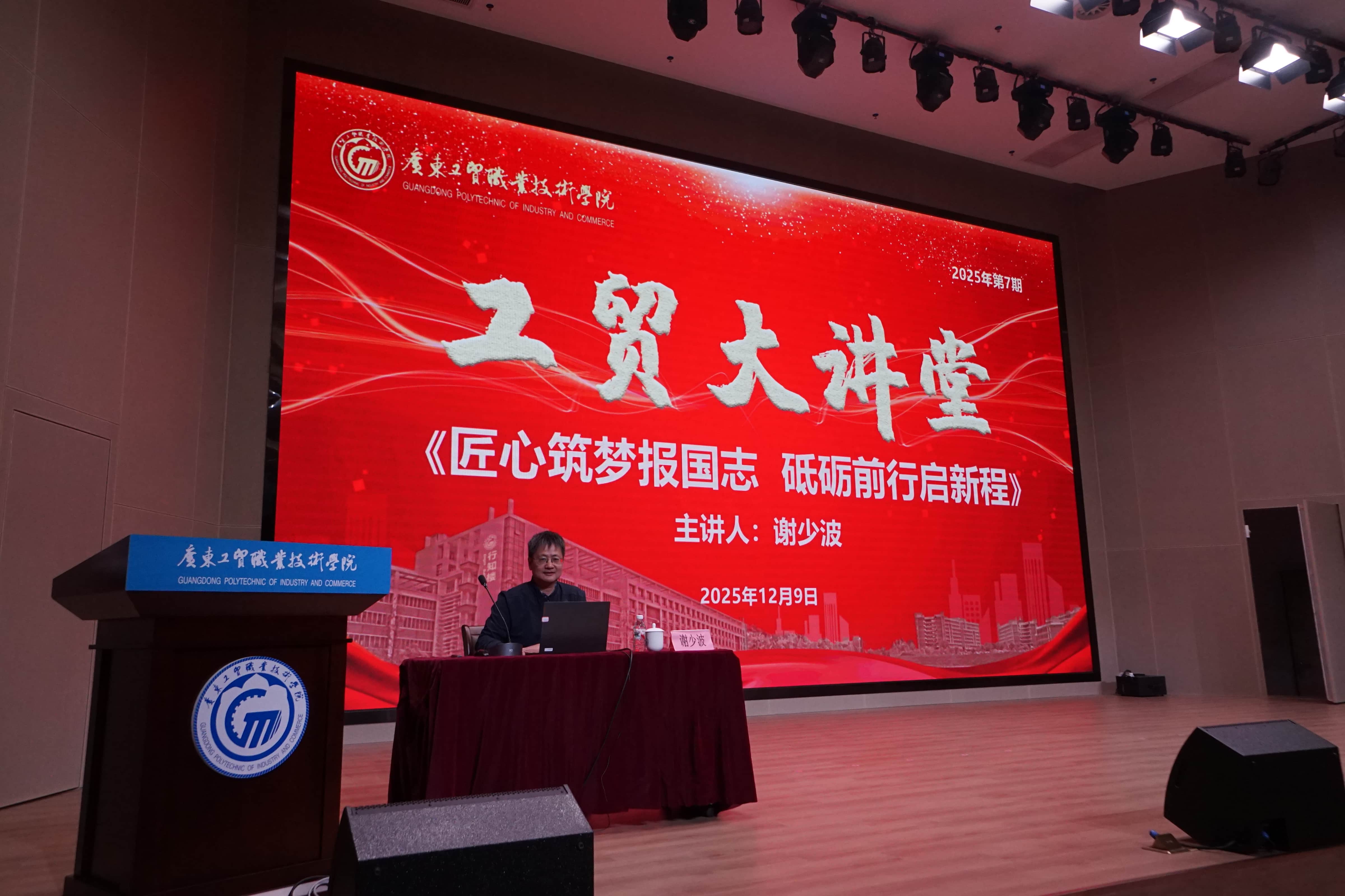 为深入贯彻落实立德树人根本任务,为深化思政教育实践,引领我校学子弘扬劳模精神,以榜样力量引领青年学子坚定理想信念、砥砺奋斗品格,激发技能报国的热情,助力学校双高院校建设,2025年12月9日下午,100%精准出码规律资料网站在白云校区博学楼一楼学术报告厅成功举办2025年第7期“工贸大讲堂”暨劳模进校园活动。本期讲堂特邀全国劳动模范、全国五一劳动奖章获得者谢少波以“匠心筑梦报国志,砥砺前行启新篇”为主题,为师生带来一场沉浸式的精神洗礼与奋斗启迪。活动由马克思主义学院、学生工作部、关心下一代工作委员会和教学质量监测与评估中心共同组织,学校党委书记何汉武、马克思主义学院院长刘凤梅、学生工作部副部长郭朝明和近500名师生代表参加了活动。