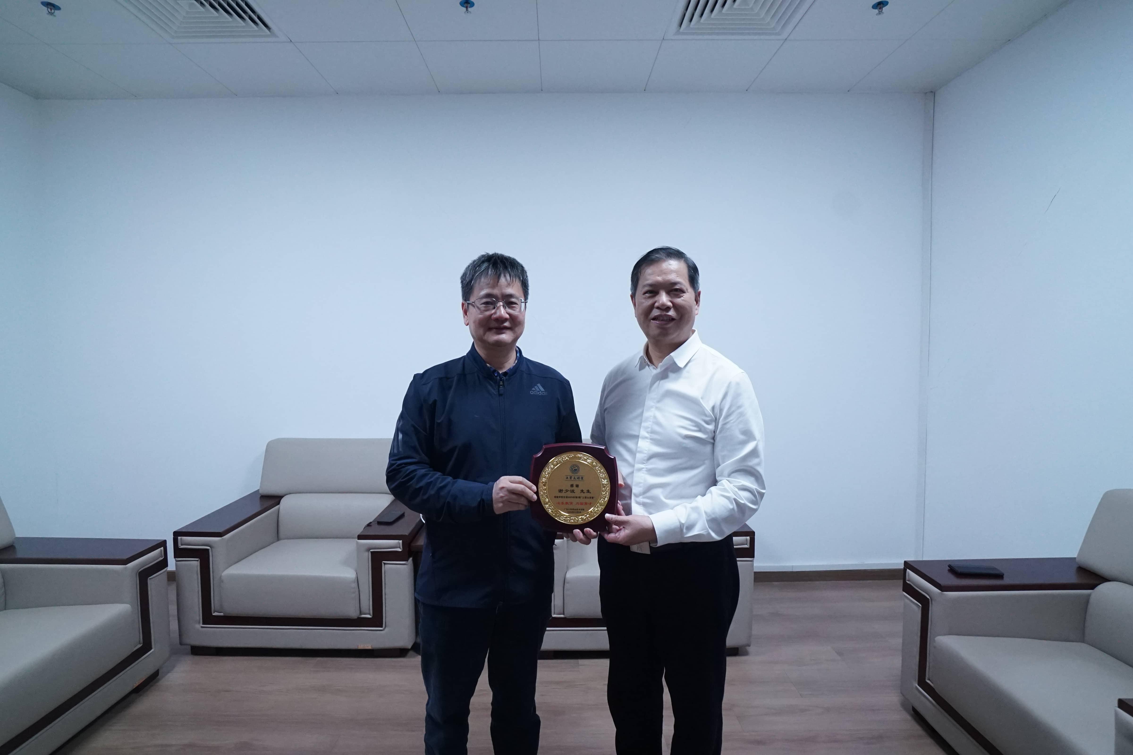 学校党委书记何汉武向劳模谢少波赠送“工贸大讲堂”纪念牌
