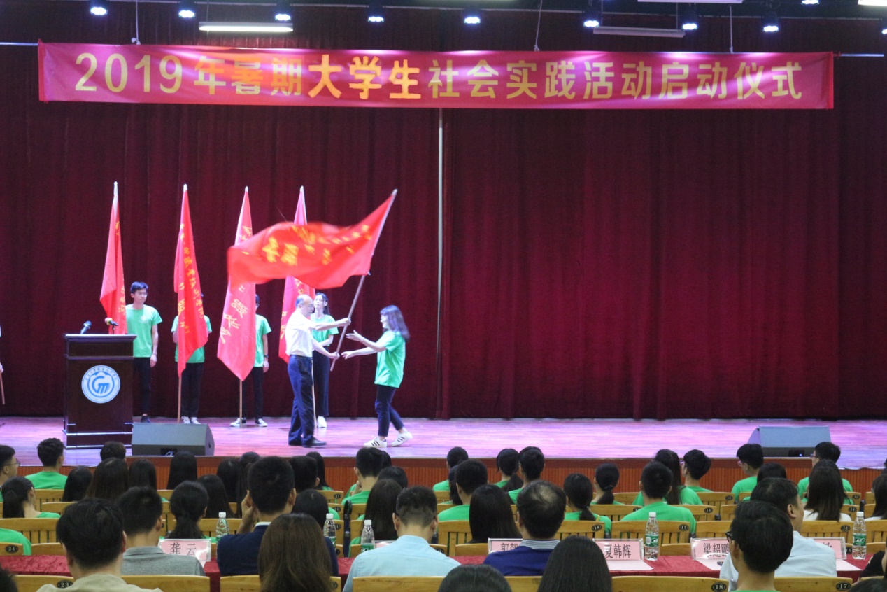 随后,夏韩辉副书记为我校暑期社会实践活动服务队代表授旗。代表们接过旗帜便要谨记夏书记对我们的寄予,做新时代的工贸志愿者积极拥抱新时代、奋进新时代,以饱满的热情和昂扬的斗志,以挑战自我、百折不挠的勇气,以艰苦奋斗、锐意进取的工贸精神,不忘初心,牢记使命,积极投身大学生暑期社会实践活动,在加快学校一流高职建设的新征程中描绘出无愧于新时代的宏伟蓝图!用奋斗的最美丽的青春献礼祖国70周年华诞 !