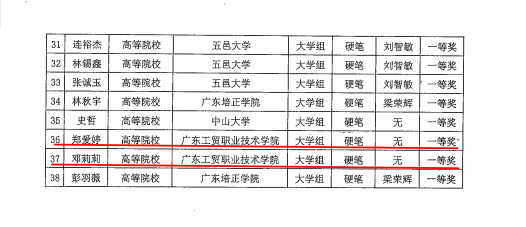 近日,广东省教育厅、广东省语言文字工作委员会公布了第十一届广东省大中小规范汉字书写大赛获奖结果,我校郑爱婷、邓莉莉同学荣获大学组硬笔一等奖,谭小玲同学获大学组硬笔二等奖,马锦旗、肖岳森同学获大学组硬笔优秀奖。机械工程学院周红云老师教师组硬笔优秀奖。