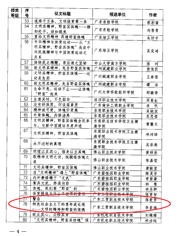 近日,由广东省教育厅举办的“文明其精神、野蛮其体魄”主题案例征集和征文活动,经公示无异议,公布了获奖名单。我校师生踊跃参与,最终共5名学生获得了学生组征文奖项,其中二等奖(示范征文)2名、三等奖(优秀征文)3名。