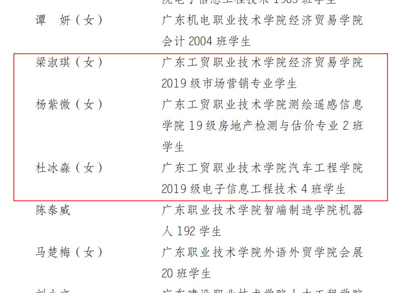 在建团100年之际,我校共青团工作传来喜讯。近日,根据团省委公布的《关于表彰2021-2022年度广东省五四红旗团委(标兵)、五四红旗团支部(标兵)、优秀共青团员和优秀共青团干部的决定》(团粤发【2022】14号),学校应用外语学院19旅游英语专业2班团支部荣获“广东省五四红旗团支部”称号,测绘遥感信息学院团委书记陈君浩荣获“广东省优秀团干部”,经济贸易学院2019级市场营销专业梁淑琪、测绘遥感信息学院2019级房地产检测与估价专业杨紫薇、汽车工程学院2019级电子信息工程技术杜冰淼等3名学生荣获“广东省优秀共青团员”称号。