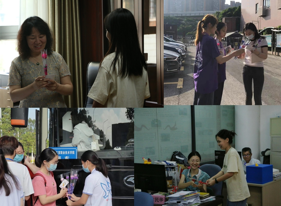 清晨,天河、白云、荔湾三个校区的同学们在各个办公楼、教学楼前等待就位,准备向各位老师送出教师节的第一份祝福。一枝枝鲜艳欲滴的康乃馨,象征着老师们春风化雨,对学生的无私奉献之情;一张张充满感激之情的卡片,饱含了工贸学子对辛勤付出的老师们的无限感恩之情;一声声“老师,祝您节日快乐!” “老师,您辛苦了!”承载了我校学子对老师们的感激和祝福。