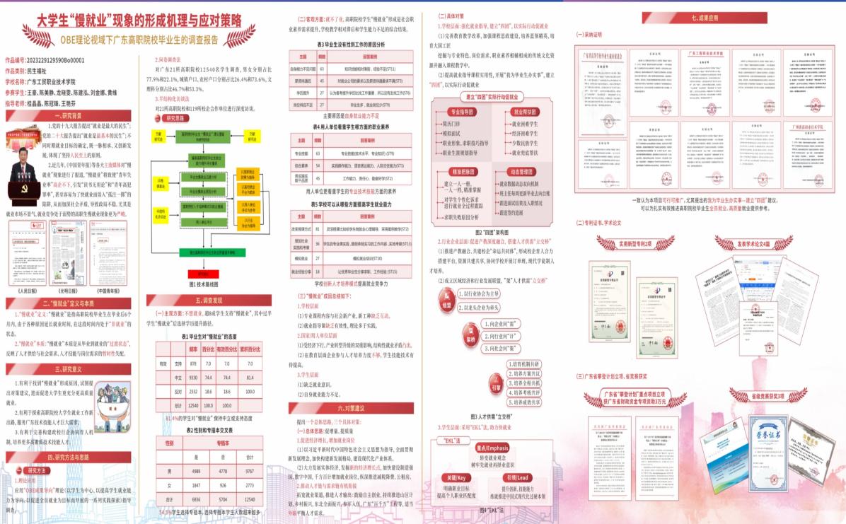 近几年,各大主流媒体对“慢就业”现象进行了报道,“慢就业”将致使“青年失业率”高企不下,甚至容易为了快就业而误入“孤注一掷”的陷阱,从而加深社会矛盾,尤其是就业市场不景气、就业竞争处于弱势的高职生慢就业现象更为严峻。为促进高职院校大学生更加充分、更高质量就业,项目团队运用问卷调查法和半结构化访谈法,历时11个月,走访广东21所高职院校和119所校企合作单位,采用“OBE成果导向”理论,对“慢就业”现象进行了深入调研,有发现超八成学生不反对“慢就业”,专业课程内容与社会实际岗位需求脱轨,就业指导课程缺乏有效性,受经济下行影响,社会就业岗位数量减少且企业参与人才培养力度不够,学生面向新模式、 新工种的就业能力不足等。针对“慢就业”现象,我们提出了一个总体思路,三个具体对策,总体思路是:促增量、提质量,并提出完善教学改革,加强课程思政,建立“四团”促就业;促进产教深度融合,搭建人才供需“立交桥”,形成机制共研、考核共评等5个协同育人“引擎”,采用“EKL”法助力快就业等对策,从而助力学生快就业、充分就业、就好业,项目成果被省就业促进会、3个行业协会和13所高职院校采纳,同时获得广东省“攀登计划”重点项目立项,荣获“挑战杯”省赛特等奖等荣誉。