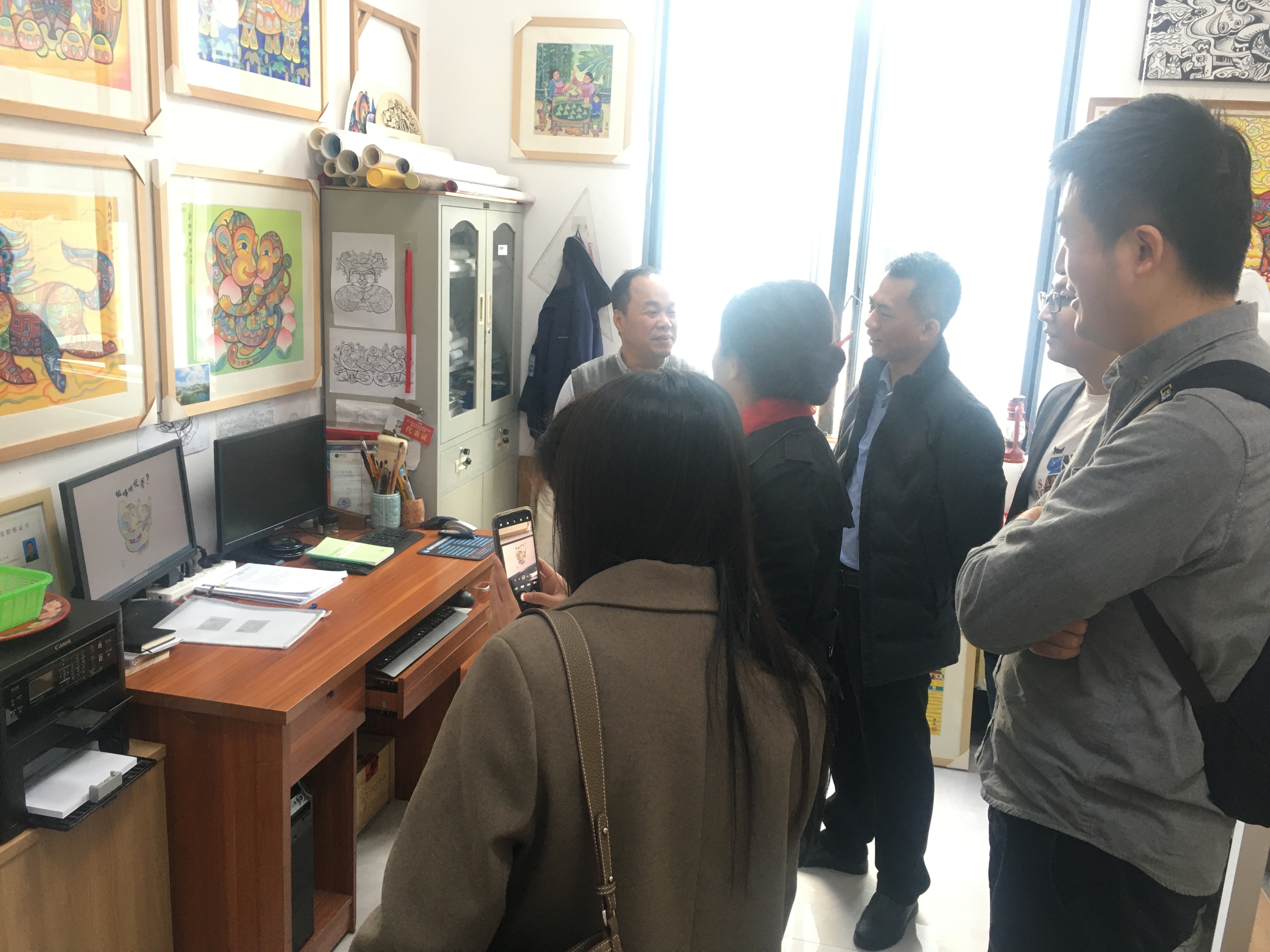 调研组一行首先参观了农民画展馆、博物馆,与农民画画家开展交流,了解农民画的历史起源、发展进程、现实困局,并就农民画的文创、宣传、推广等方面进行了探讨。