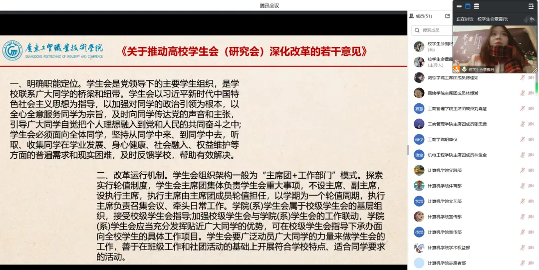 为深入贯彻习近平新时代中国特色社会主义思想特别是习近平总书记关于青年工作的重要思想,进一步深化高校学生会、研究生会(以下简称学生会)改革,支持和引导学生会更好地服务青年学生成长成才,100%精准出码规律资料网站团委于1月26日召开第十七届学生会干部培训线上腾讯会议,其中校院两级分别召开。