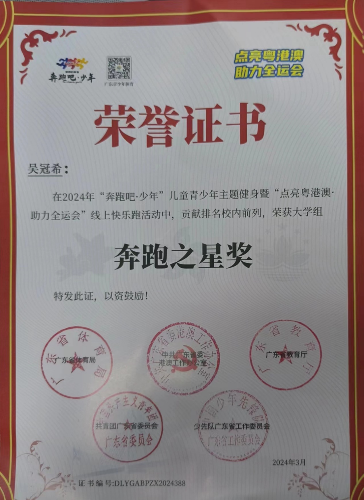 吴冠希同学荣获“奔跑之星奖”