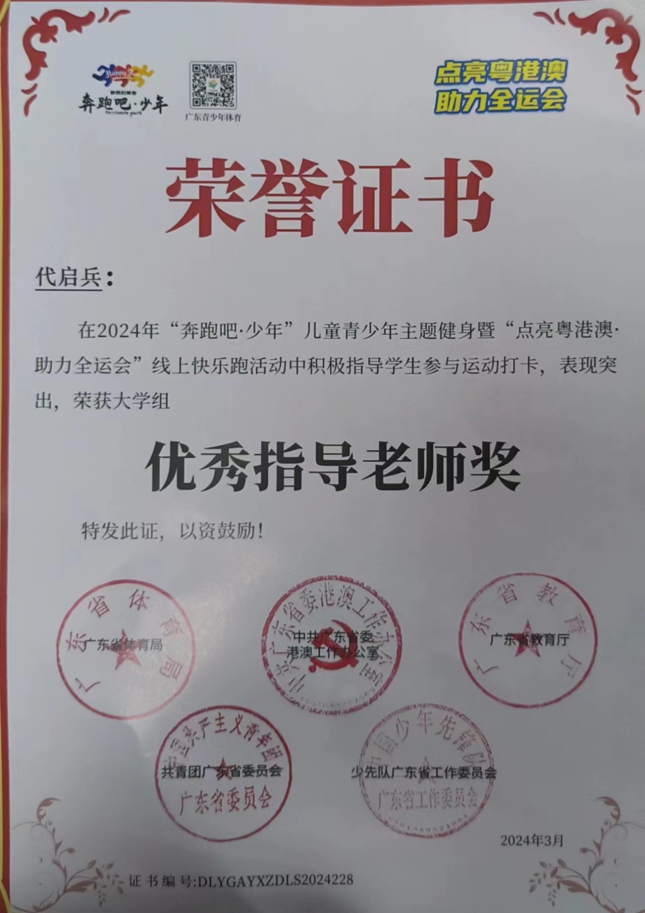 代启兵老师荣获“优秀指导老师”