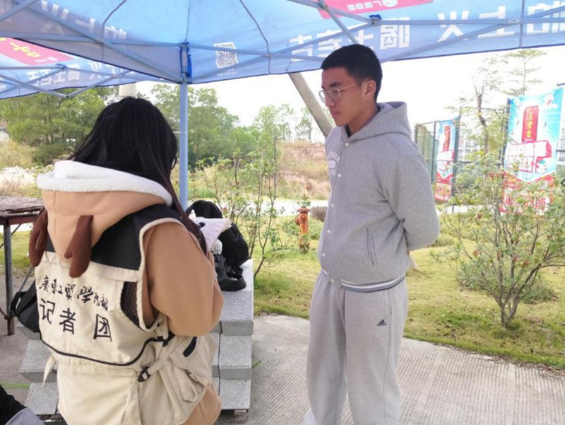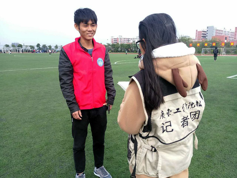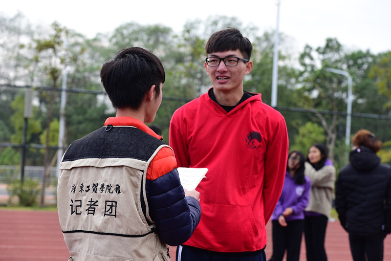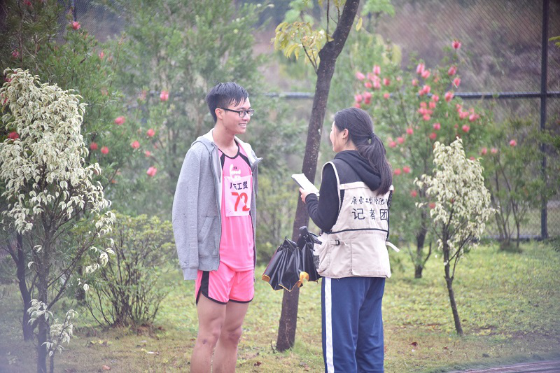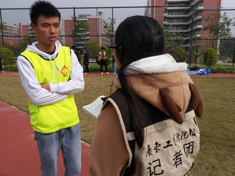 石挺建同学是志愿者队伍中的一员,他说他们的工作主要是维持现场的秩序还有配合医疗队解决突发情况。在比赛过程中会出现运动员摔倒等情况,他们要及时去帮助运动员,并且在比赛进行时及时拦住横穿跑道的同学们。对于能够帮助到更多人,成为比赛人员的后援,他表示很开心!