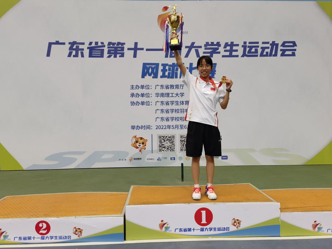 5月30日上午,在华南理工大学五山校区举行的广东省第十一届大学生运动会网球丙组女子单打比赛中,我校经贸学院19级学生国贸专业学生梁颖琪不负众望,在赛场上英勇拼搏,最终以6:1的比分击败来自食品药品职业技术学院的选手,勇夺桂冠!赢得我校在本届省大运会上的首枚金牌!体艺部刘羽老师、测绘学院刘楚泽老师获优秀教练员称号。
