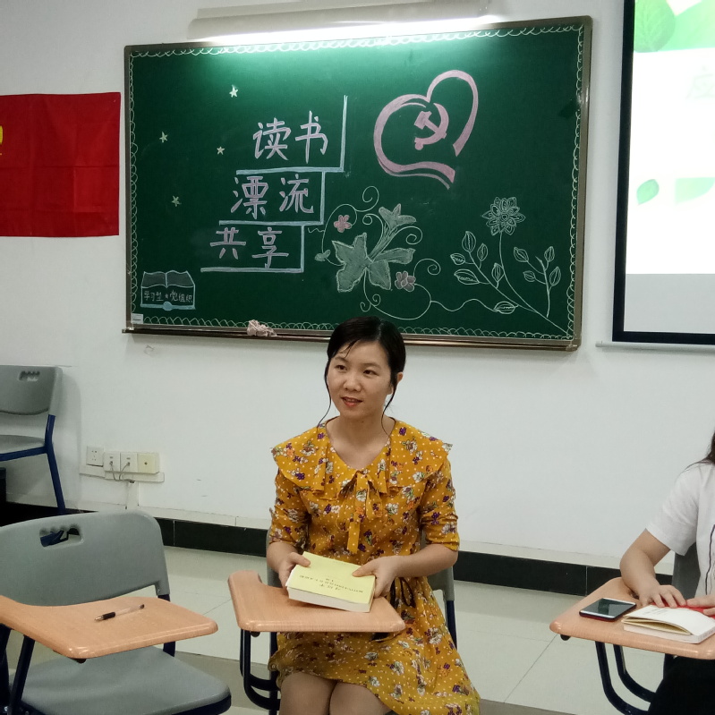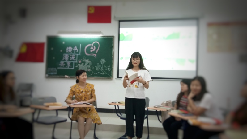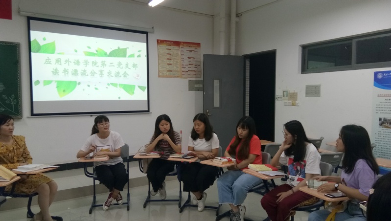 《朗读者》主诗人董卿说:“读书让人学会思考,让人能够沉静下来,享受一种灵魂深处的愉悦。”为了促进读书的进一步深化和拓展,培养广读书、读好书的浓厚学习氛围,打造“书香支部”文化,以党员为引领,使一个人读书变成一群人在读书,共享读书,分享交流。应用外语学院第二党支部本学期开展了“读书﹒漂流﹒共享”为主题的系列读书西漂流活动。在我们进行第一期漂流之后,近日,支部组织党员和积极分子在教学楼1-618课室举行了读书交流分享活动。外语学院学生第二党支部书记王燕玲老师和支部16名党员和积极分子参加了本次学习分享活动。