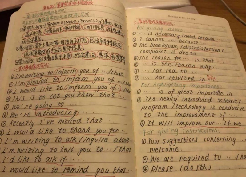 师姐在五个多月的备考日子里,每天坚持挪出1小时进行专题复习,每部分题型都有专门的笔记本和错题本。笔记本是用来记下重点难点考点和题型解答方法,错题本记录错题,找出做题规律。阅读和听力两部分对师姐来说是薄弱点,所以大部分时间都花费在这两方面,关于阅读,师姐每天都花一个小时练一整套阅读卷子,做完以后对答案,把错的找出原因并用笔记本记录下来。