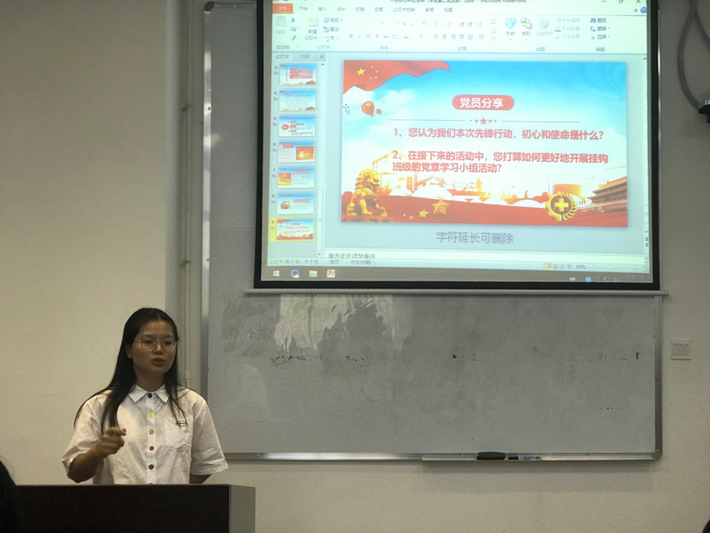 此次活动主要以“不忘初心、牢记使命”为主题,认支部为更好地发挥党员先锋模范作用,启动了“党员先锋岗”,通党员挂钩班级一对一的形式,负责到底地为班团提供服务和指导,负责协助各班更好地来开展党章学习小组活动。通过开展内容丰富、形式多样的班级党章学习小组活动,党建引领团建,全面开展班级爱党、爱国、爱校的学习和实践活动引领新生班级的同学们认真学习党的理论知识,积极努力向党组织靠扰。