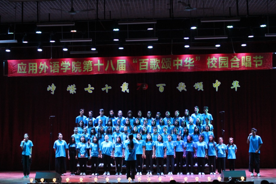 此次比赛应用外语学院全体成员都参与其中,候场班级跃跃欲试,台上班级群情激昂,上场的每一位同学,都将饱满的感情融入歌曲,表达对祖国母亲的热爱和祖国山河的眷恋。精彩的合唱赢得了观众热烈的掌声,也获得了评委嘉宾的青睐。