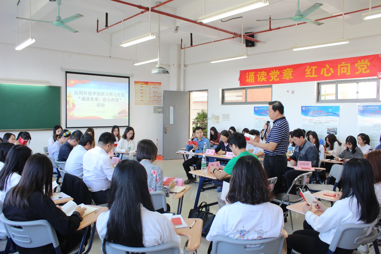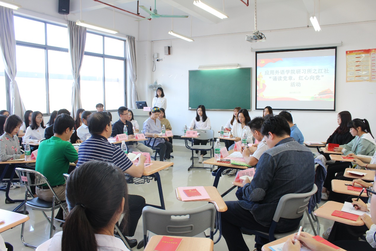 “坚持党和人民的利益高于一切,个人利益服从党和人民的利益……”11月8日下午,应用外语学院研习所之江社举行了“诵读党章 红心向党”主题教育,大会全体师生在学校党委副书记、校长何汉武的带领下,集体诵读了《中国共产党章程》的“总纲”部分和中国共产党党员的义务。会议由外语学院学生第一党支部书记陈晓玲主持。党委委员、校办主任吴浩,外语学院师生党员及发展对象参加了活动