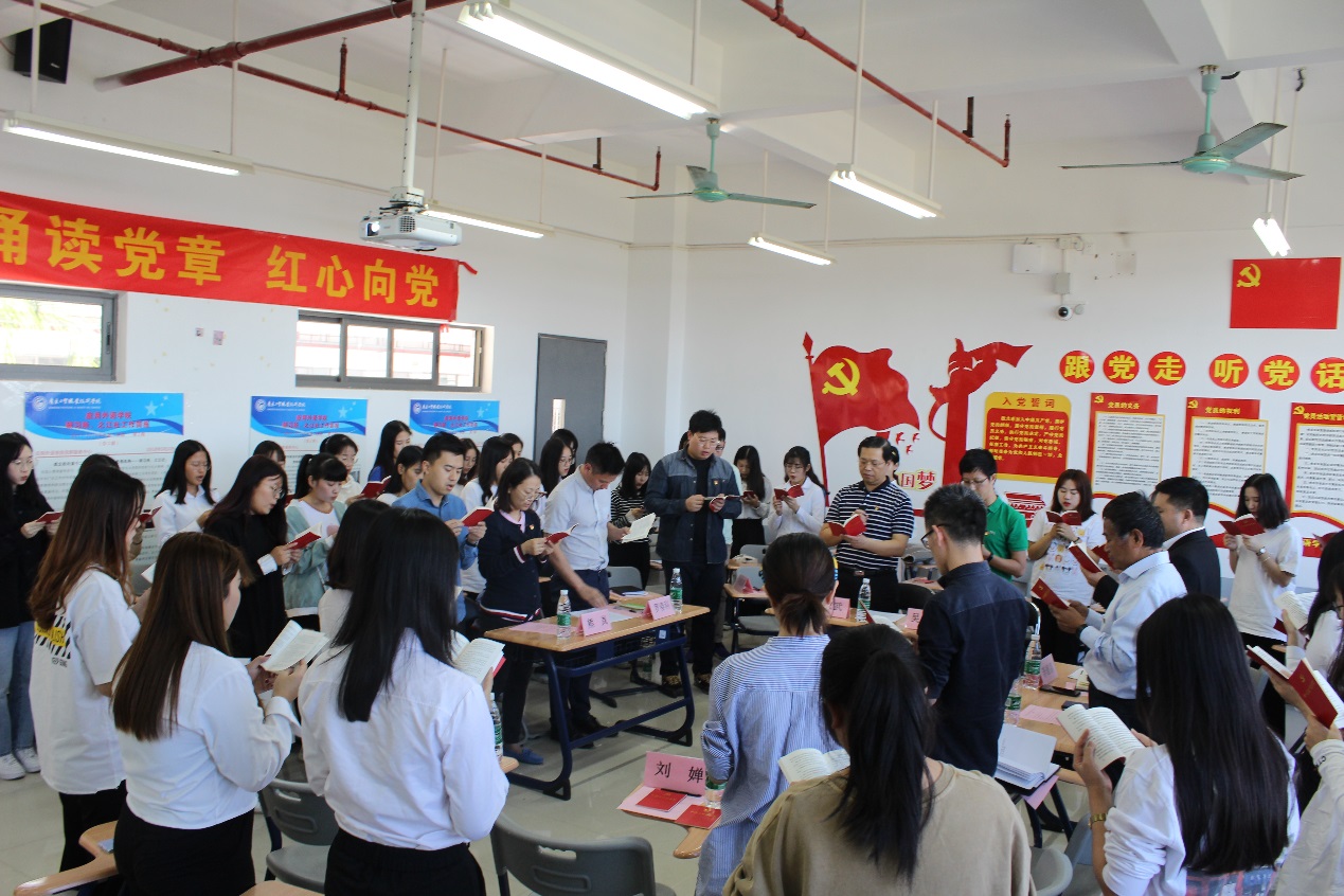 会上,校长何汉武带领全体师生齐声诵读《中国共产党章程》。诵读中,师生们严肃认真,声音洪亮有力,认真领会党章的内容。诵读的声音充溢着整个教室,党的理论滋润着每个人的心田。