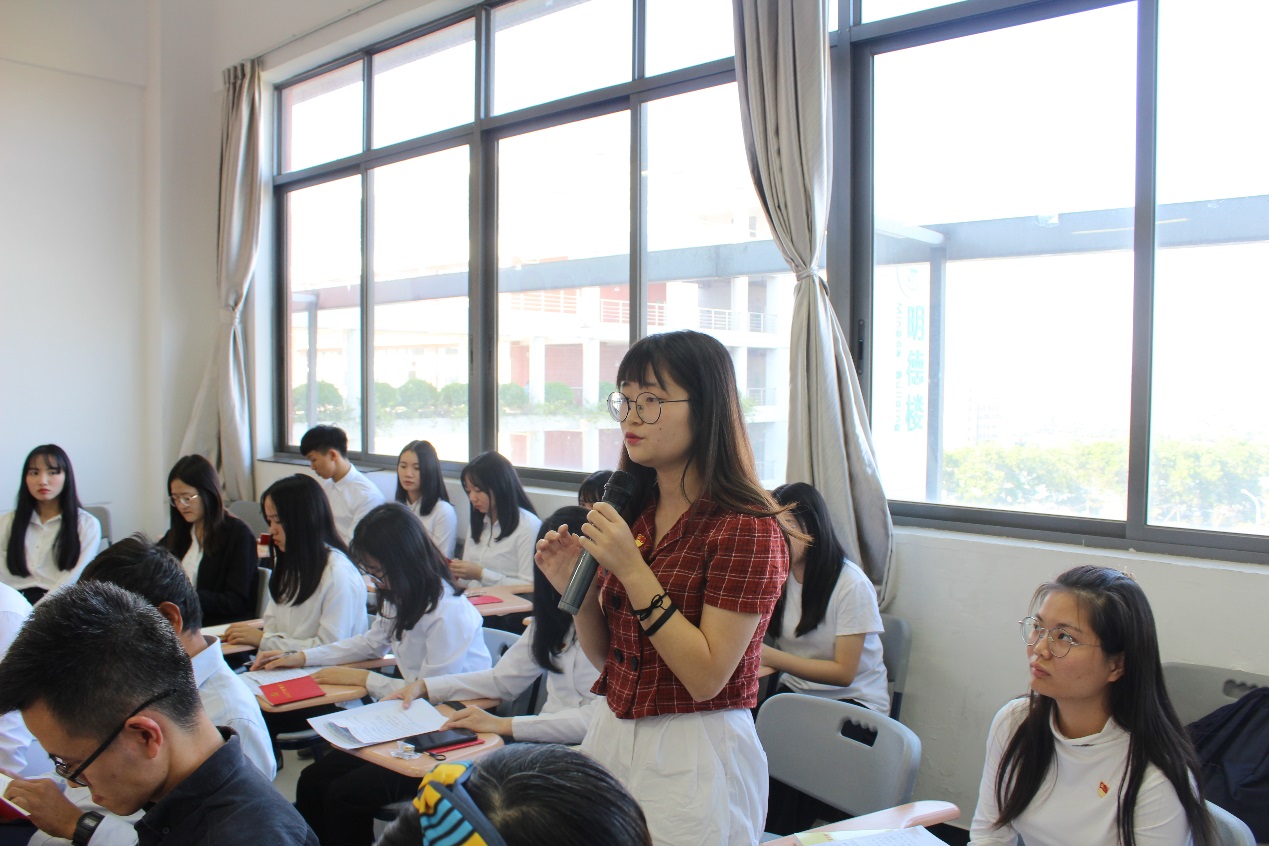 随后,学院学生第二党支部书记王燕玲分享了诵读党章后的心得体会。她表示,在工作和生活中要贯彻党员“吃苦在前,享受在后”的精神,日后将更加深入了解学生生活。三位学生代表也说出了自己阅读党章后的感悟,纷纷表示感谢党和国家给予他们美好和平的生活环境,感叹前人所作的努力和贡献,并期望自己能为祖国建设事业“添砖加瓦”。