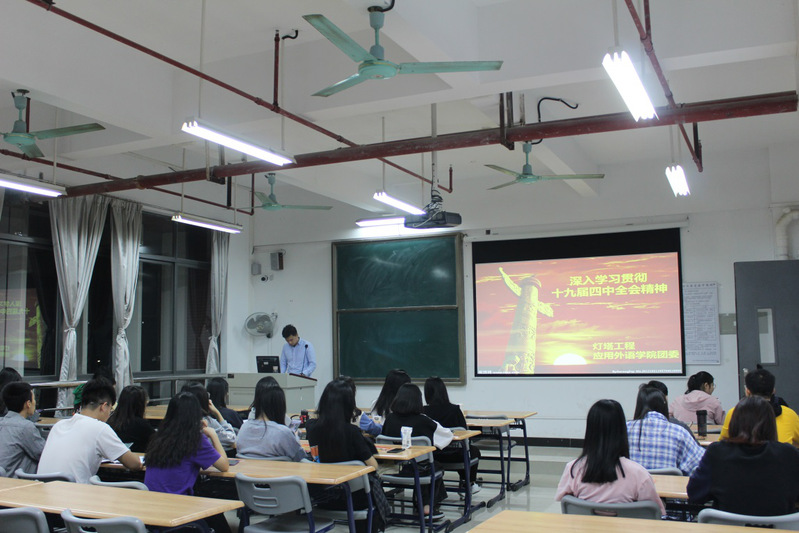 此次会议主讲人是应用外语学院学工办主任、团委书记林耀佳,他通过几组新闻数据,展现出中国特色社会主义事业取得的巨大成功,再结合此次大会的内容,让全体团干分组谈体会。要坚定不移地坚持中国共产党的领导,深入贯彻落实党的十九届四中全会精神,坚持和完善中国特色社会主义制度、推进国家治理体系和治理能力现代化。将学习与实践结合起来,青年学生干部要积极践行社会主义核心价值观,争当六有青年!