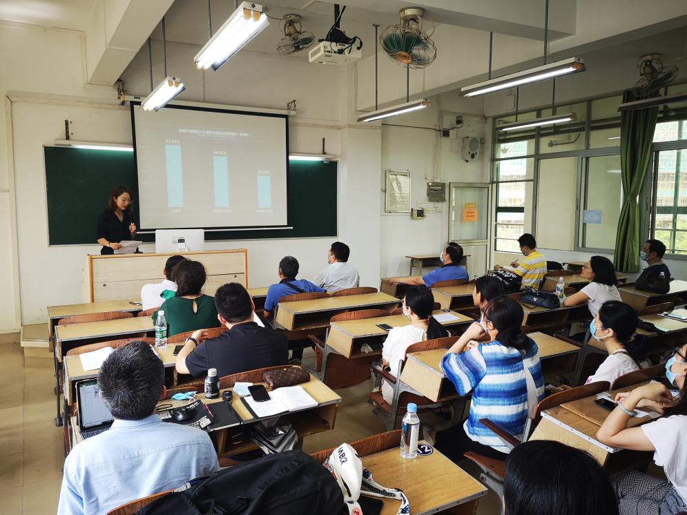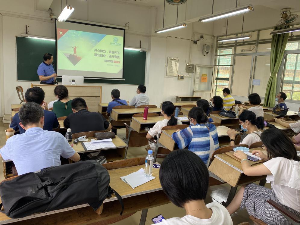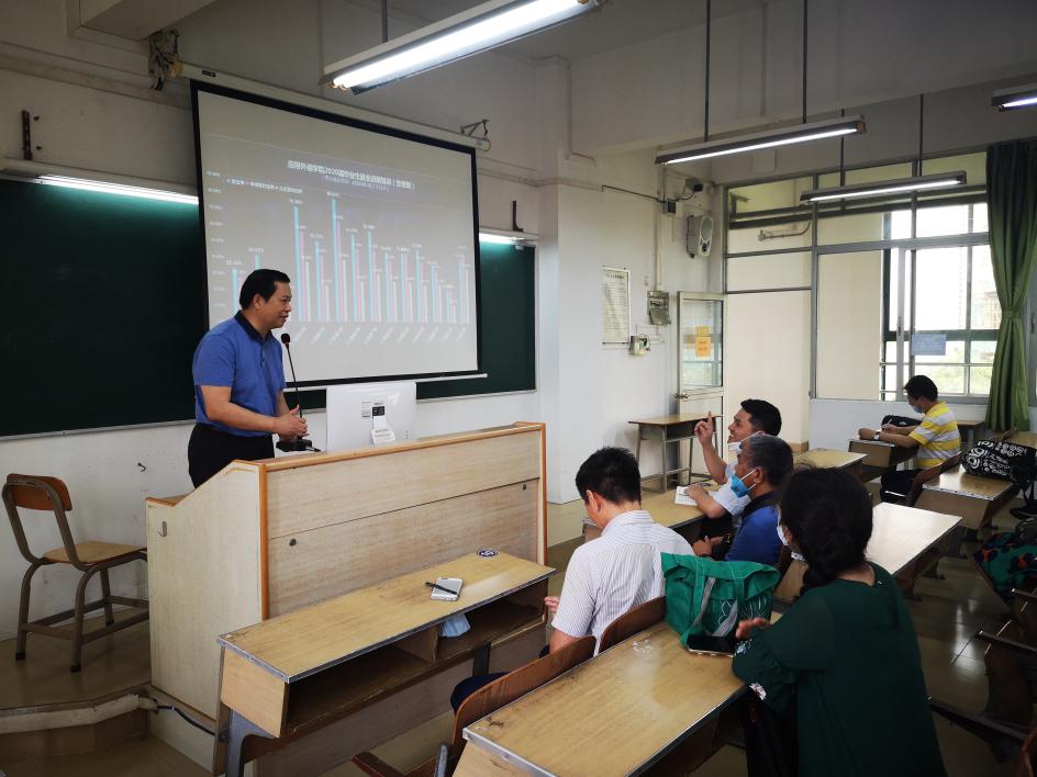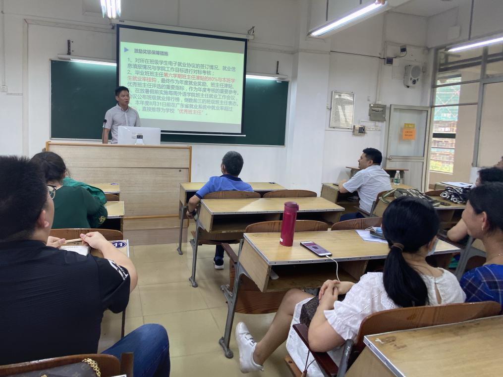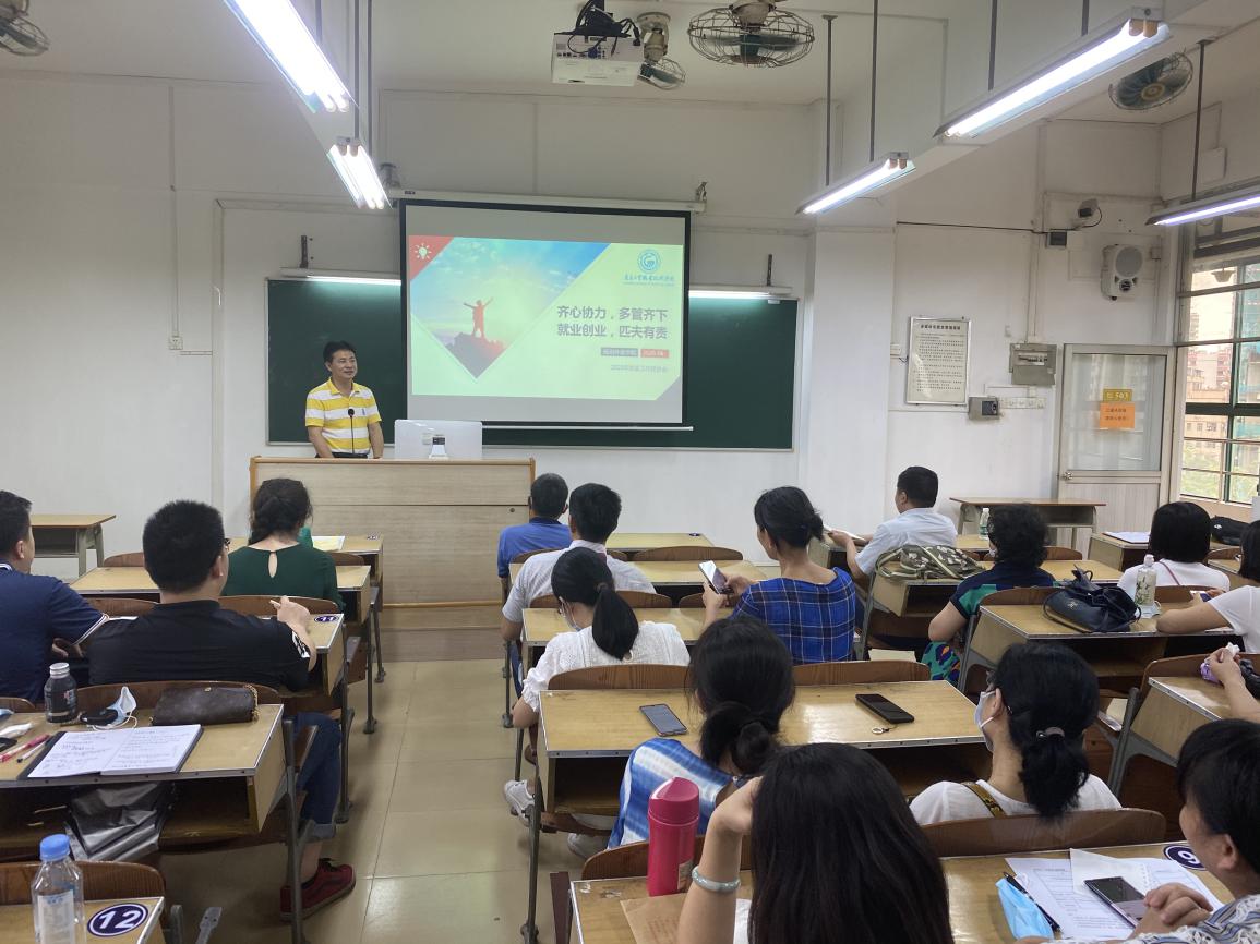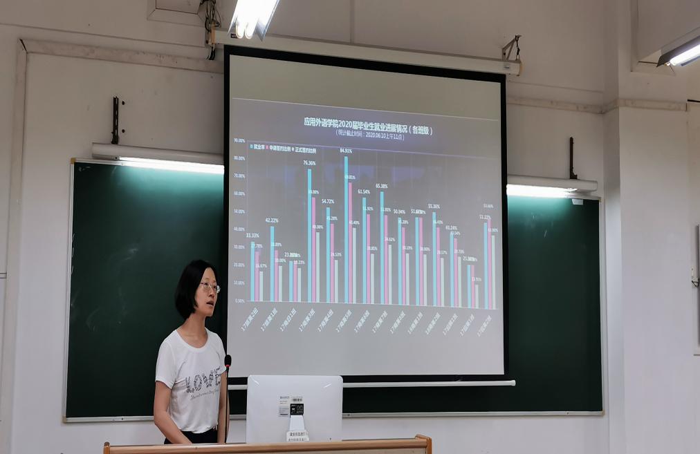 学院党总支副书记罗春科从就业工作目标、组织领导、工作措施、职责分工、保障措施等四大方面,向全院教职工解读《应用外语学院推进2020届毕业生就业工作实施方案》,学院党政领导班子积极动员动员广大教师参与到就业工作中来。