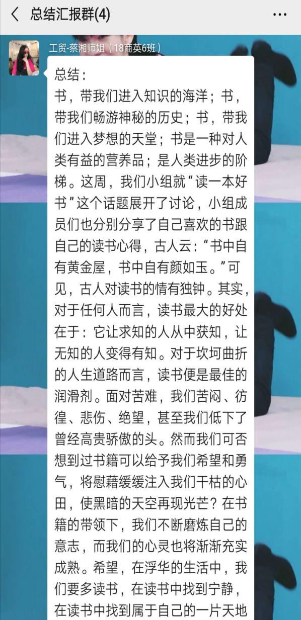 在本次活动中,同学们以线上讨论与写读书心得的形式,将经典好书的时代背景与内容和当代青年的使命担当相结合,就此分享自身心得体会。习近平总书记说过:“读书可以让人保持思想活力,让人得到智慧启发,让人滋养浩然之气”。在疫情期间,我院党员和入党积极分子铭记党的教育,跟随党的指引,读一本好书,分享一本好书,提升个人素质,保持自我的思想活力,滋养自身的浩然之气。在此活动中,同学们纷纷拿起手上的书籍,认真阅读,表达了自己的思想,“少年智则国智,少年富则国富,少年强则国强 ”这句话时时敲打着当代青年。