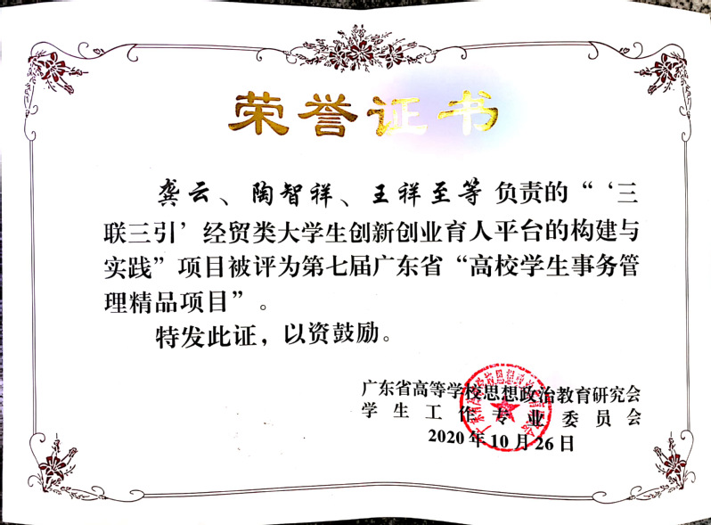 经济贸易学院学生工作项目‘三联三引’经贸类大学生创新创业育人平台的构建与实践获第七届广东省“高校学生事务管理精品项目”(负责人:龚云、陶智祥、王祥至)
