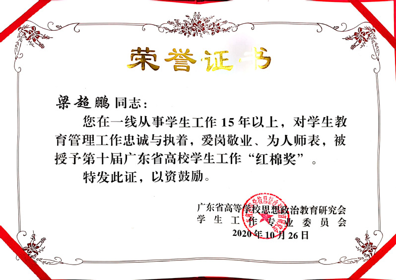 机电工程学院党总支副书记总梁超鹏获第十届广东省高校学生工作“红棉奖”;