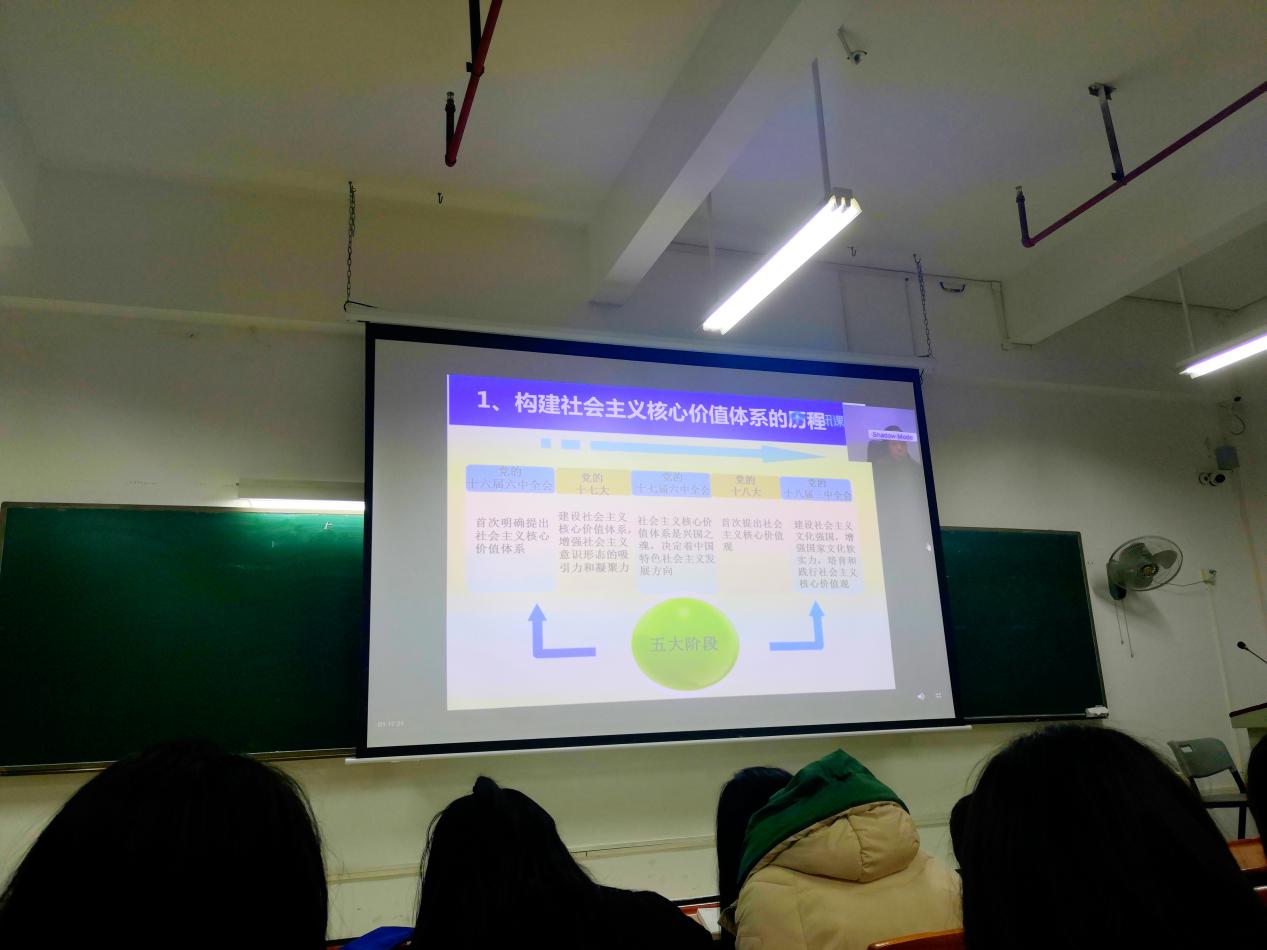 丁妙珍在课上带领同学们回顾了习近平总书记的五四运动100周年大会的讲话的内容,并从学习贯彻《习近平谈治国理政》、青年为什么要培育和践行社会主义核心价值观、培育和践行社会主义核心价值观的背景、社会主义核心价值观的内涵以及如何践行社会主义核心价值观等五大方面与同学们进行深入的交流与分享。