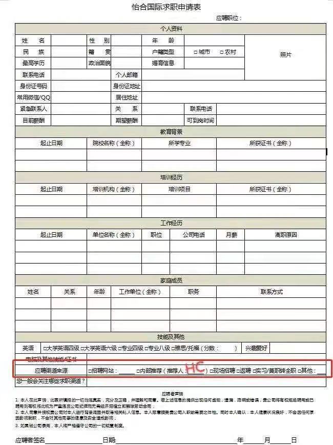 候选人在填写求职申请表时,在应聘渠道内部推荐栏上填上:HC