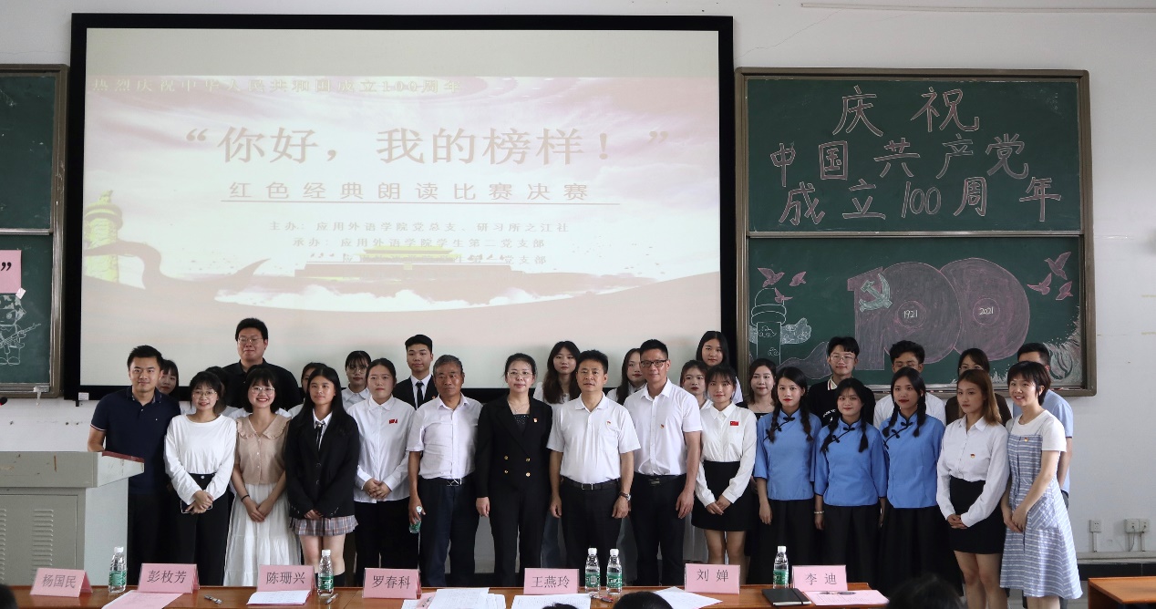 为深入开展党史学习教育,传承红色基因,弘扬革命精神,引导外语学子共抒爱国情怀,4月22日,由应用外语学院党总支、研习所之江社主办,学生第二党支部、党群服务中心、学生第一党支部共同承办的“青春献礼建党100周年|你好,我的榜样!”朗读比赛总决赛在2-305举行。学校党委委员、副校长陈珊兴、外语学院党总支副书记、院长彭枚芳、党总支副书记罗春科、副院长杨国民以及学院部分党员教师代表参加本次总决赛。