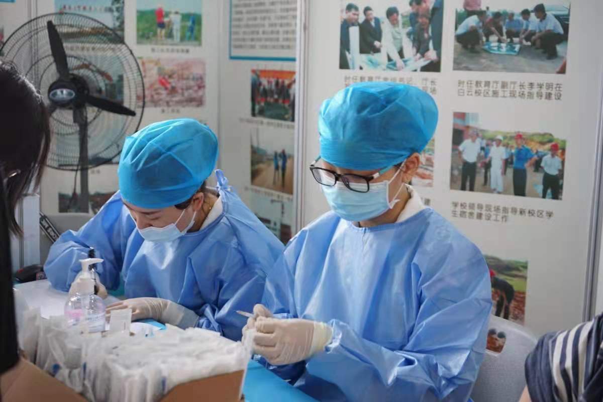 正是夏季炎热酷暑时,志愿者开展工作的同时早已汗流浃背。尽管如此,志愿者们依旧坚守工作岗位,在志愿者们的努力安排下,等待打疫苗的学生有序地排起了队伍并快速地前进着。医护人员面对着需要打疫苗的同学们,从容而又娴熟的给每位同学打上第二针疫苗。观察区的同学在自行观察30分钟无异常后,就在指定地点排队盖完章便完成了第二针疫苗的接种过程。
