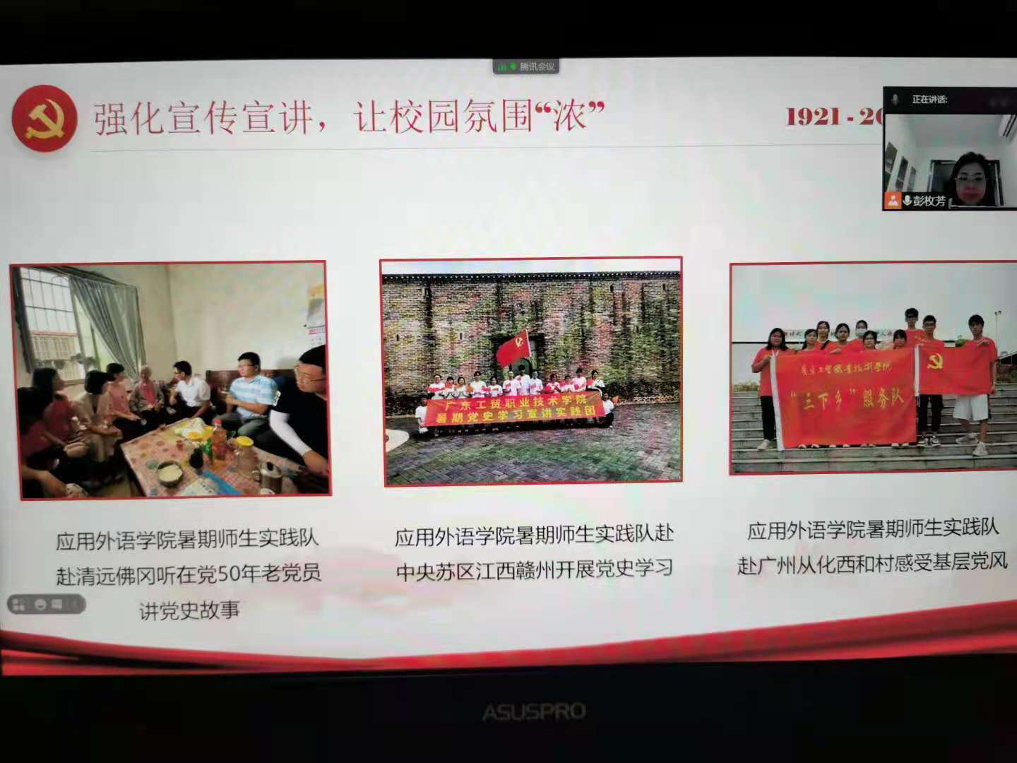 根据粤工贸院教办〔2021〕12 号文,应用外语学院教工第二党支部在七月中旬制定了详细的暑假党史学习教育工作安排表---通过集中学习与个人学习相结合、线上学习与线下学习相结合的方式,支部全体党员在暑假期间每两周开展一次(共四次)党史学习教育专题学习。以紧抓“基层党员”来统领全院的党史学习教育,确实做到思想不放假、工作不放松、学习不断线,持续巩固和拓展我院党史学习教育成效。