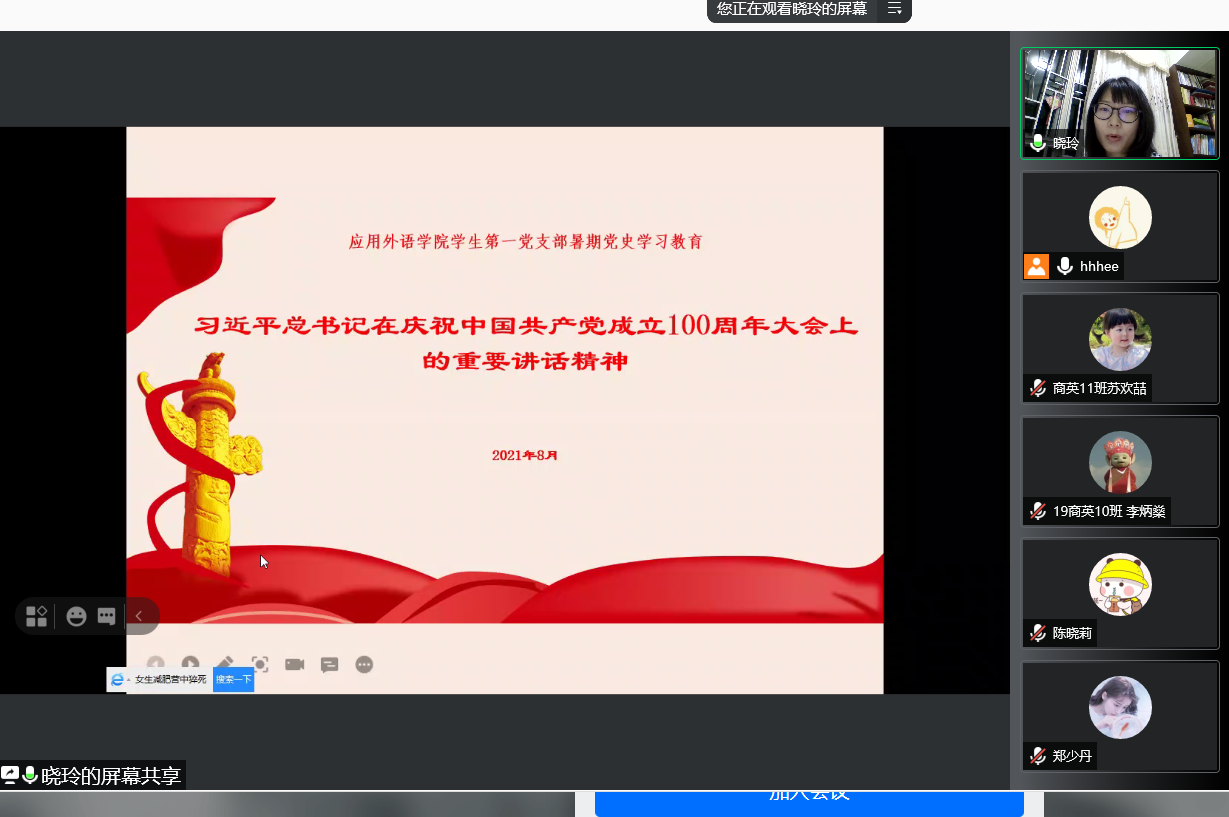 812日晚,应用外语学院学生第一党支部在线上开展暑期党史学习教育专题会,全体党员把学习贯彻习近平总书记“七一”重要讲话精神作为党史学习教育的核心内容,从学习中汲取智慧和力量,做到学史明理、学史增信、学史崇德、学史力行。支部书记陈晓玲老师、支委林耀佳老师、李迪老师,及支部学生党员参加了本次专题学习会,会议由陈晓玲主持。