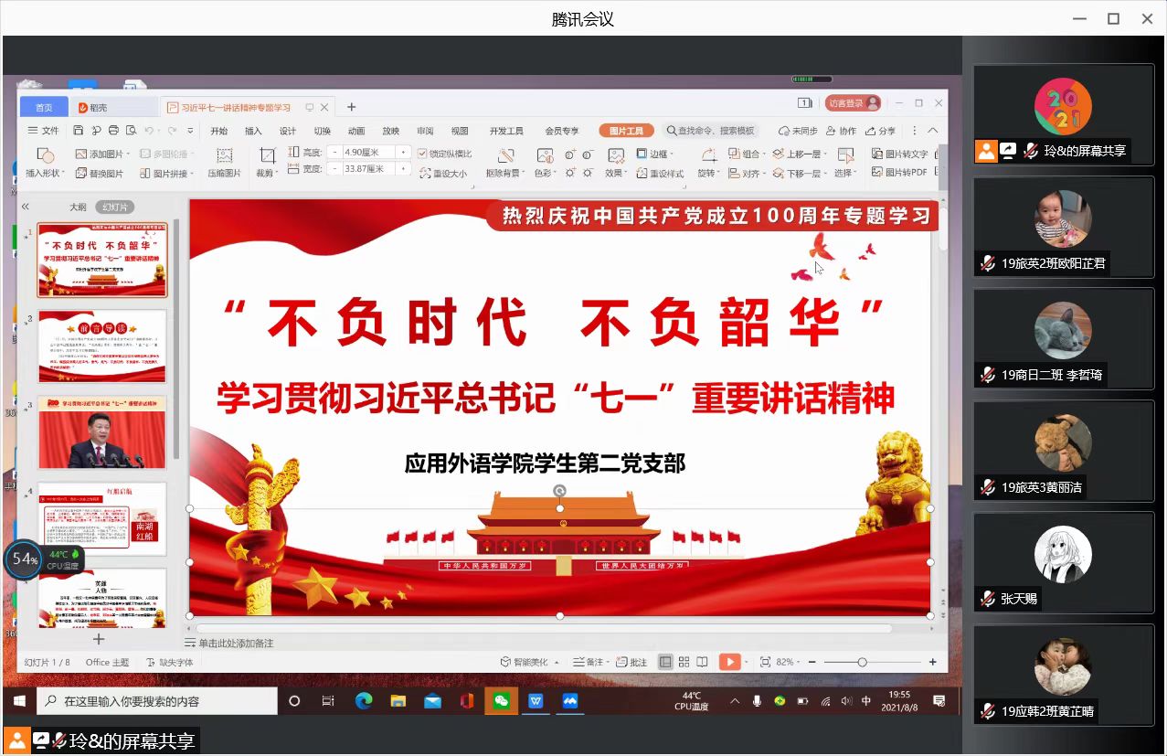 为深入领悟习近平总书记“七一”重要讲话精神内涵,激励青年大学生砥砺奋进新时代,8月14日,应用外语学院学生第二党支部开展主题为“不负时代,不负韶华”学习贯彻习近平总书记“七一”重要讲话精神线上再学习,支部书记王燕玲、支委刘婵、冯锐骐以及43名学生党员参加了本次学习。