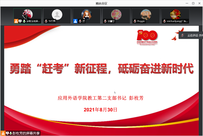 8月30日晚,应用外语学院教工第二党支部在腾讯会议召开暑期第四次专题学习研讨会,继续推进暑期党史学习教育工作。全体党员参加了本次会议。