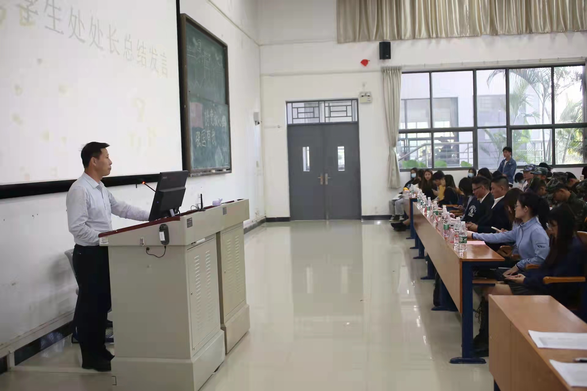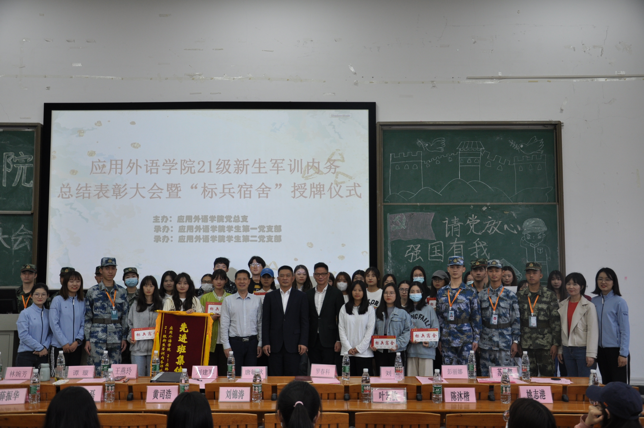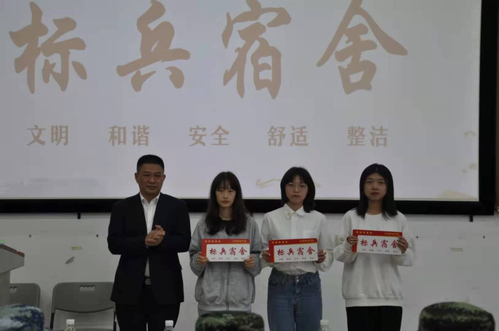 在为期十三天的集中军训中,广大外语受训同学在政治思想、组织纪律、内务卫生及各项训练科目中取得了显著成绩,并涌现出一批成绩突出的集体。为表彰先进,12月9日下午,应用外语学院于明德楼2-104举行军训内务总结大会暨“标兵宿舍”授牌仪式。我校副校长唐毓秋、学生处处长刘建军、外语学院党总支副书记罗春科、学工办全体人员、军事爱好者协会代表以及21级新生宿舍代表参与本次活动。此次参加军训内务评比的宿舍共有227间,各宿舍都以饱满的热情投入到本次活动中,实实在在地取得了成效,进一步巩固了军训成果。