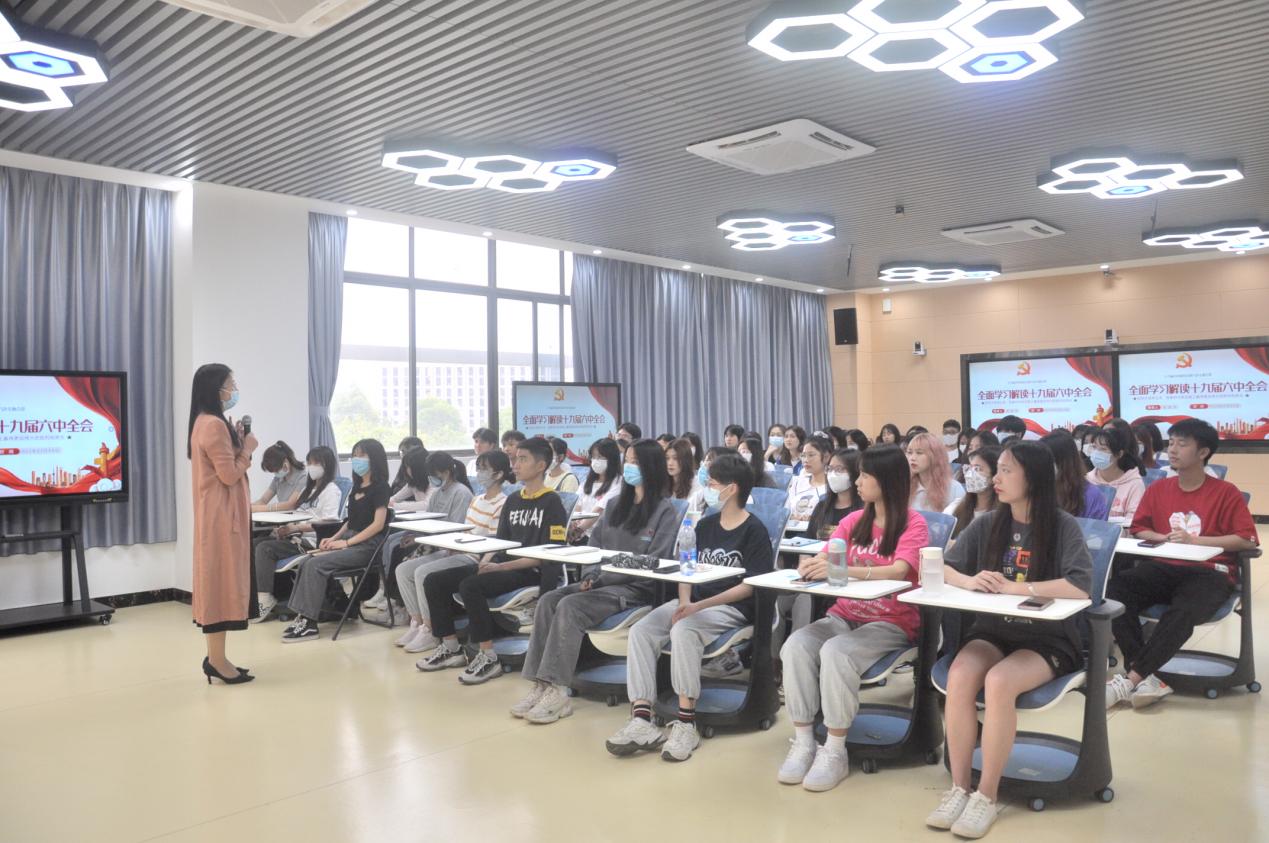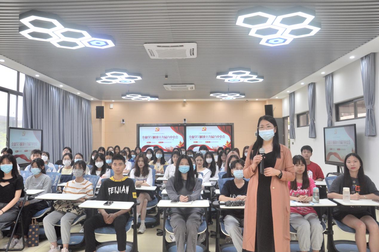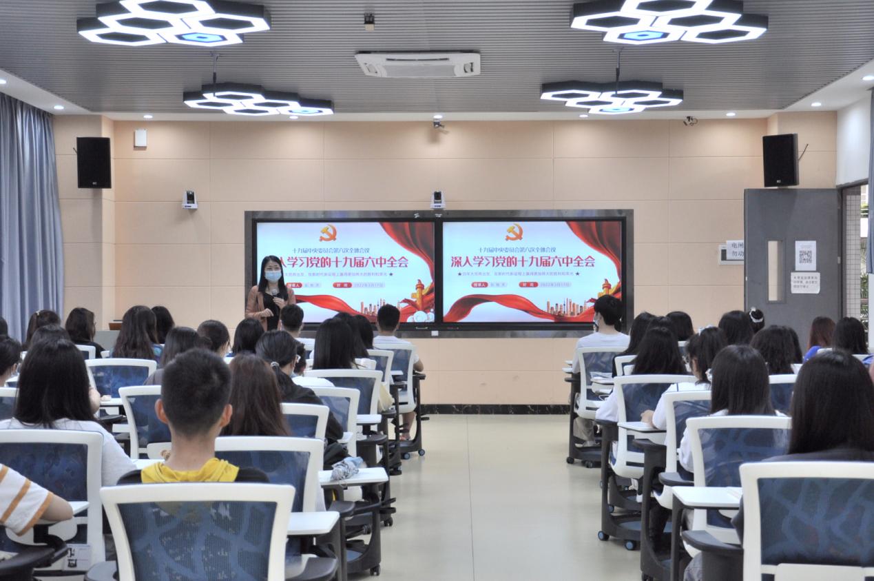 为做好疫情防控教育,积极引导青年学生深入学习领会党的十九届六中全会精神,赓续红色血脉,按照学校统一部署,3月17日下午,应用外语学院在明德楼1区316开展“深入学习党的十九届六中全会精神”思政第一课。本次思政课由外语学院院长、党总支临时负责人彭枚芳主讲,学生党员、发展对象、积极分子和学生干部共120余人参加。