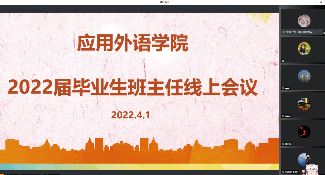 为促进2022届毕业生就业,了解学生们的就业意向与需求,解决班主任们在开展就业工作中的难处,更好地开展毕业班工作。4月1日上午,应用外语学院召开2022届毕业生班主任线上工作推进会议,学院党总支副书记罗春科、毕业班的班主任及相关辅导员参加本次会议。