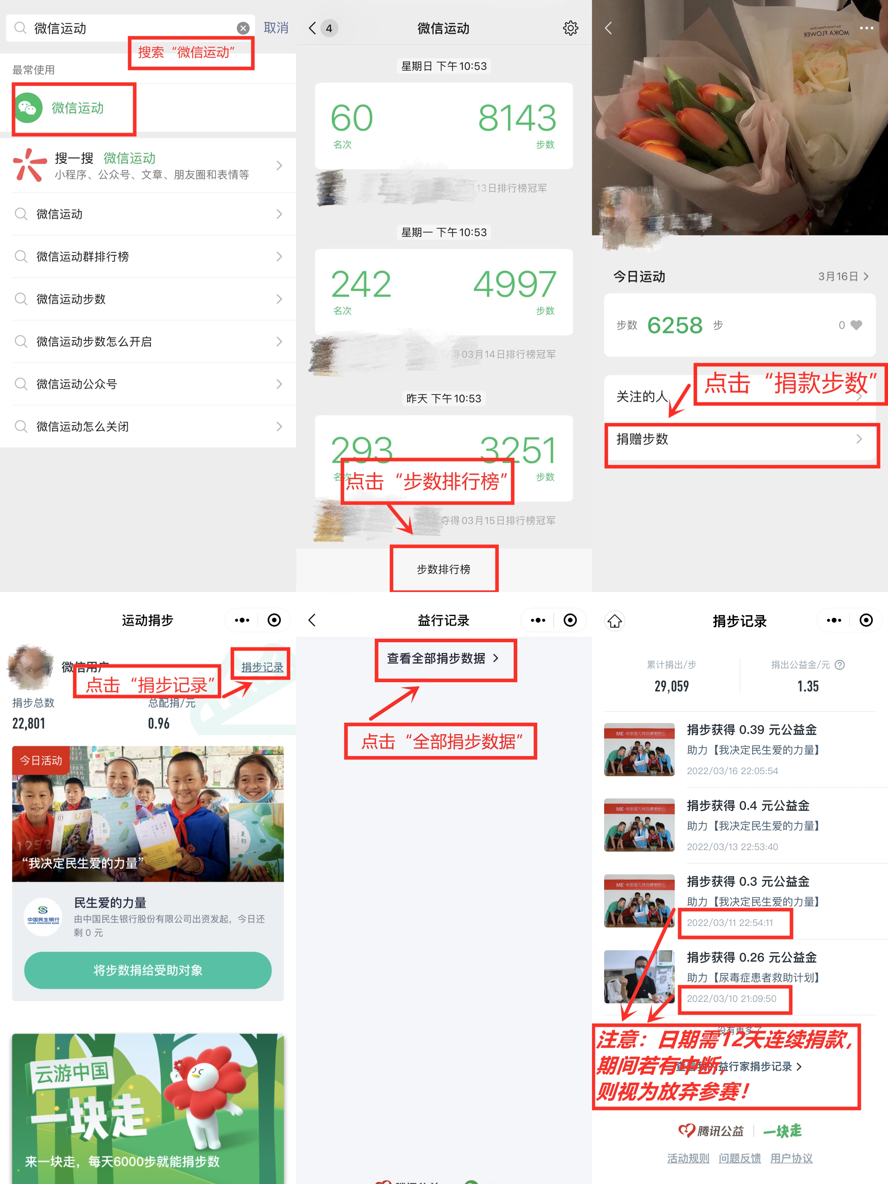 本次“益行捐步让你的每一步都更有意义”微信捐步公益活动由研习所之江社主办外语学院党群服务中心承办旨在鼓励外语学子积极参加公益活动,增强身体素质,培养社会责任感。参与者只需在31930期间,每天坚持登录微信运动小程序选择受捐项目并进行捐步6000步起捐捐赠步数后将随机产生公益金额成为每次捐赠的公益金活动结束后参与者将捐步截图统一上报给活动组织方。她们纷纷表示,希望能在公益上尽自己的微薄之力,可以帮助到更多有需要帮助的人。