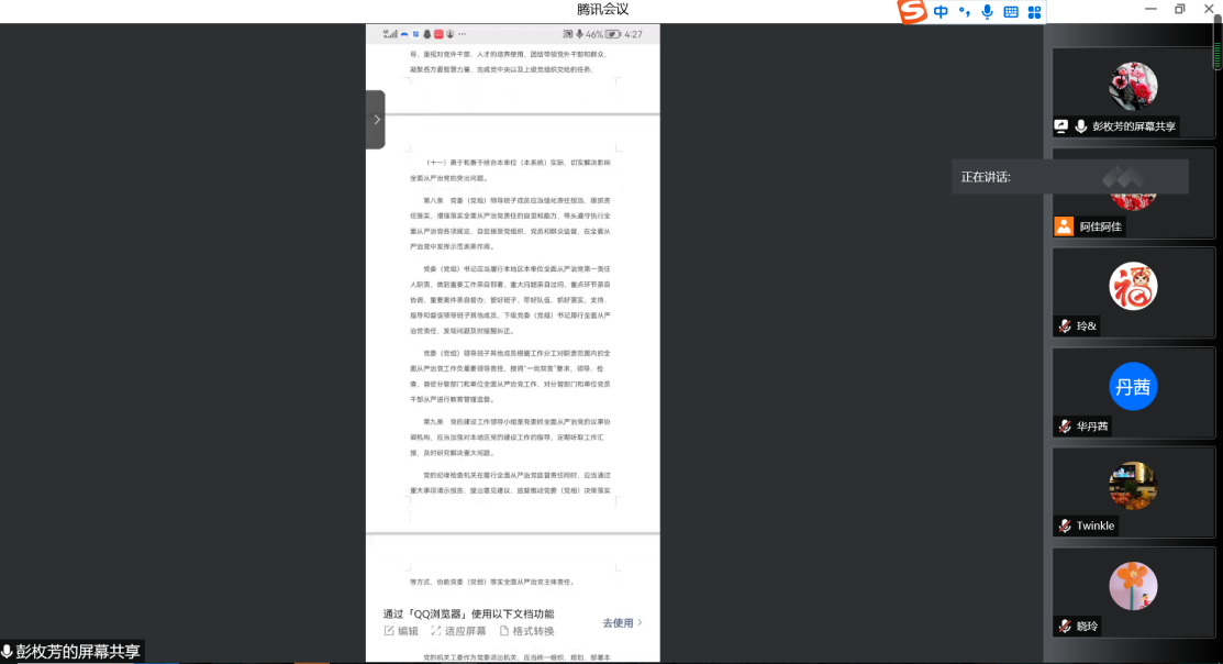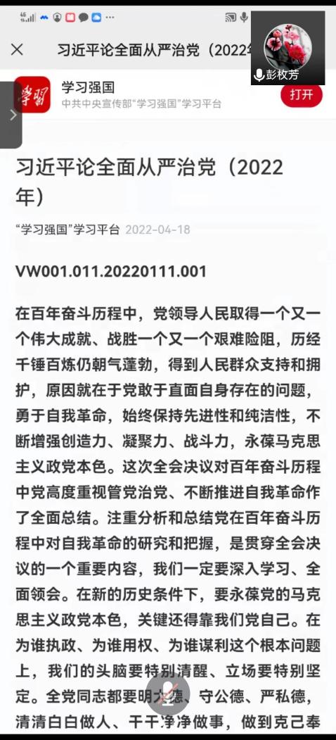 首先,彭枚芳带头学习《党委(党组)落实全面从严治党主体责任规定》(2020年2月26日中共中央政治局常委会会议审议批准),学习习近平总书记关于全面从严治党的系列重要讲话精神。彭枚芳指出,要履行全面从严治党主体责任,起好带头作用,发扬自我革命精神,永葆清正廉洁的政治本色。