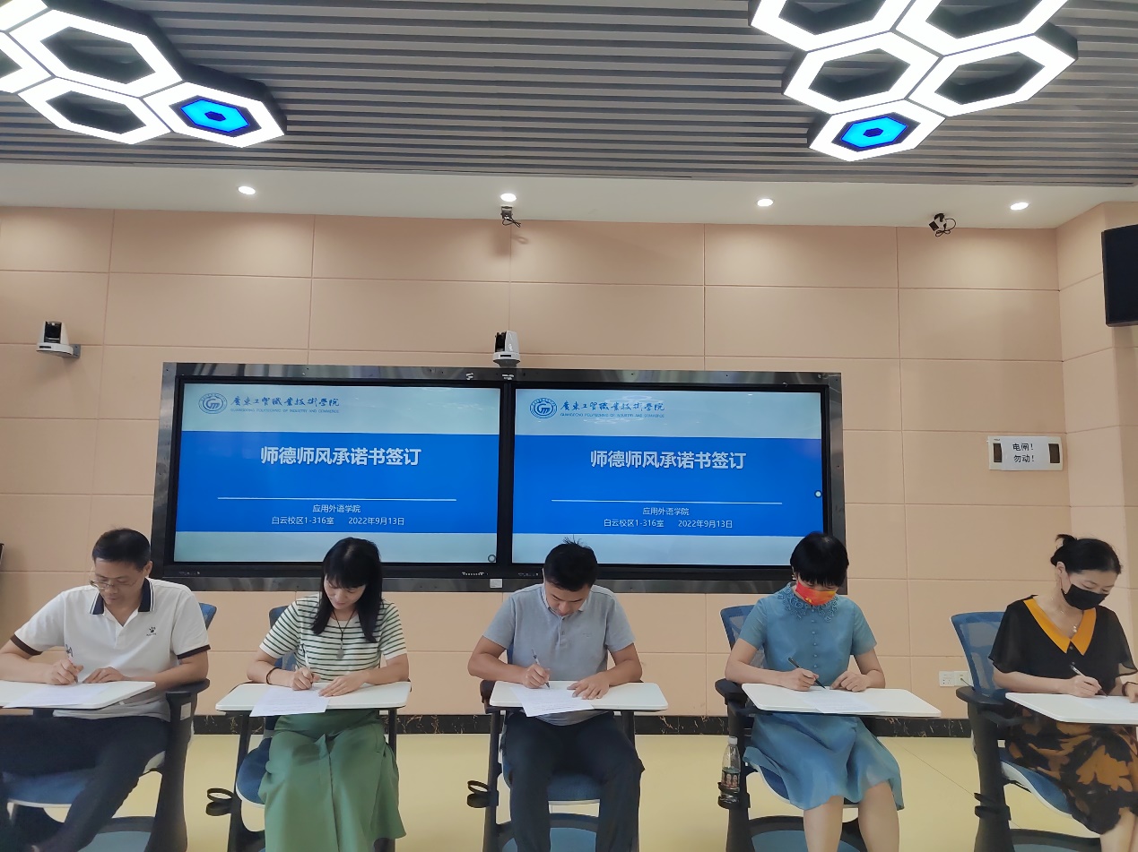 会后,外语学院领导班子与学院全体教师签署了100%精准出码规律资料网站师德师风承诺书,向社会和学校做出郑重的承诺:不断提高师德修养,自觉守护三尺讲台,争做新时代“四有”好老师。