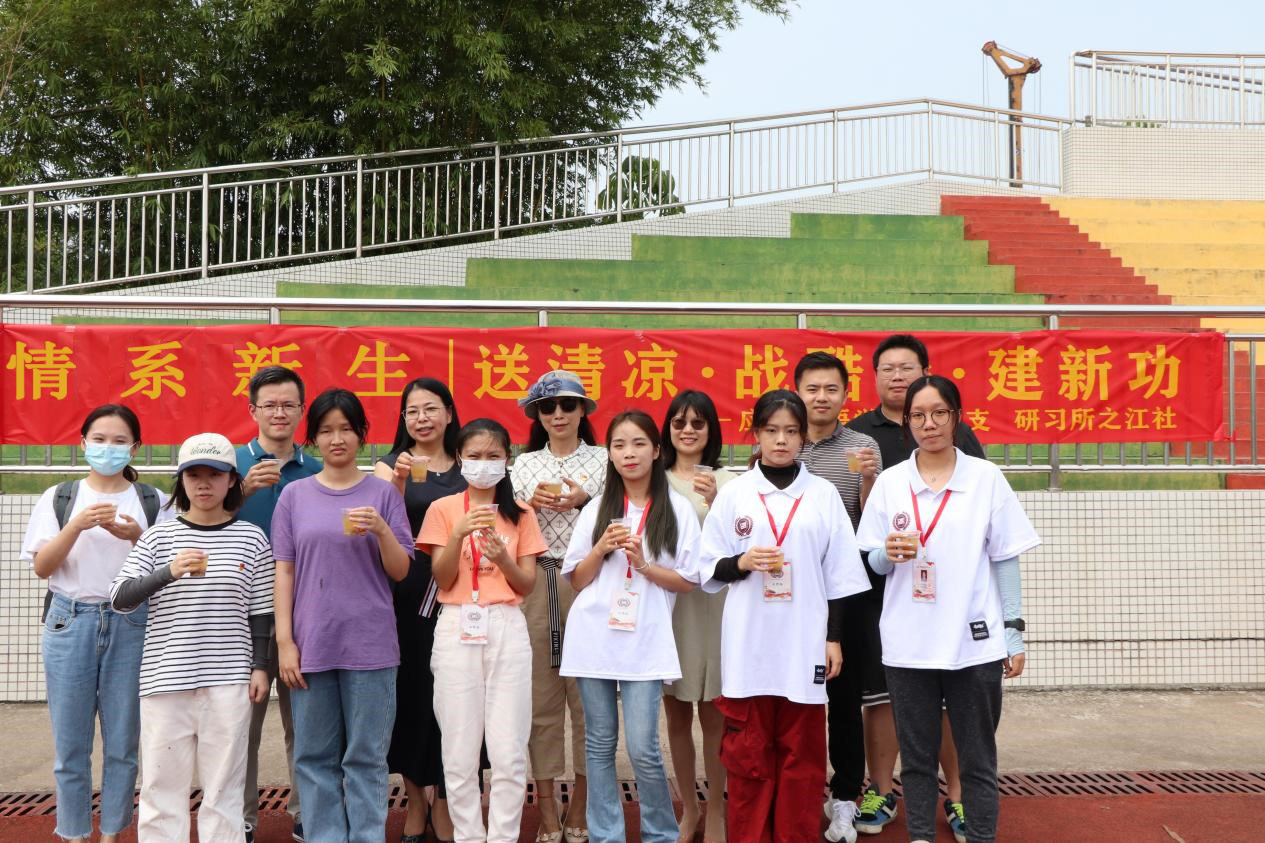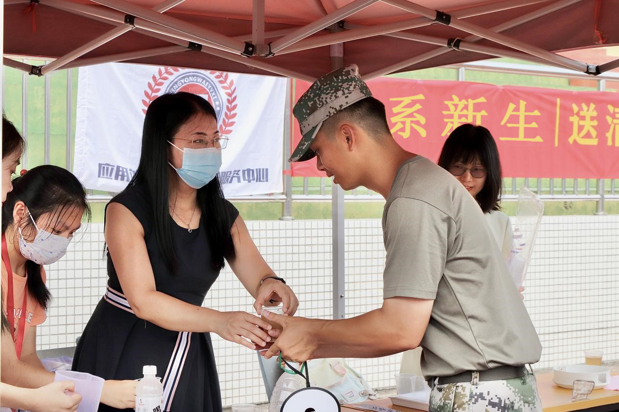 暑气蒸人,炎阳似火。随着2022级新生军训火热进行,9月23日上午,应用外语学院党总支在白云校区运动场开展“情系新生|送清凉,战酷暑,建新功”活动。外语学院党总支临时负责人成海涛、院长彭枚芳、学工办主任林耀佳及部分辅导员前往军训现场,为带训教官和新生们送去清凉。