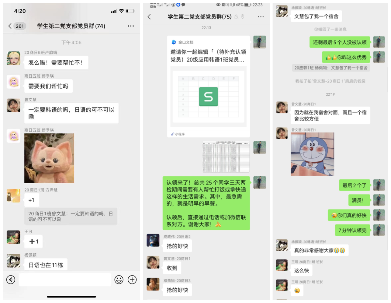 为进一步发挥学生党员先锋模范作用,协助做好应用外语学院疫情防控工作,保障好20韩语1班全体在寝室健康监测同学三天两检期间的就餐饮食等问题。自921日起,外语学院学生第二党支部学生党员积极自发组成临时志愿者队伍,开展为期3天的“隔离不隔爱”志愿帮扶行动。