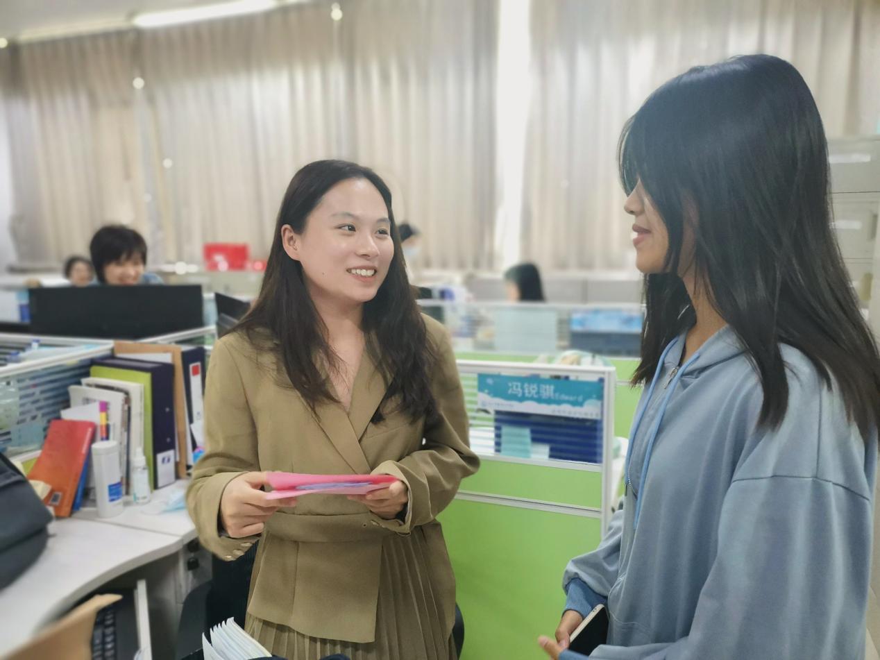 翻开贺卡,里面有通红的爱心,有简单的问候,有可爱的画作,更有美好的祝福……一张张五彩斑斓的卡纸,在同学们灵巧的手中,变成了圆形、心形、方形等形状,上面写着饱含深情的文字,配着精心设计的花边和图案,深深表达着对老师们的感激与祝福。此次活动总共收到了300份作品,经过初筛选出了43份在易班进行线上投票,最后选出了13名人气奖。此外,党群服务中心工作人员还邀请了部分同学走进办公室向可亲可敬的老师们送出真诚祝福,一声“老师,您辛苦了”凝聚起师生之间友谊的桥梁。
