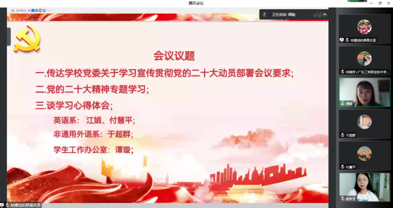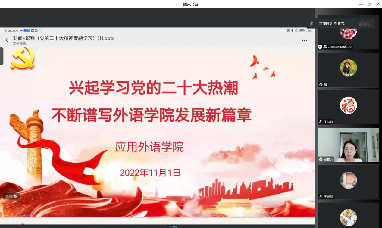 党的二十大是一次高举旗帜、凝聚力量、团结奋进的大会,在党和国家发展进程中具有极其重大的历史意义。为进一步传达学习贯彻党的二十大精神,11月1日,应用外语学院召开第二期党的二十大精神线上专题学习会议。会议由外语学院院长彭枚芳主持,全体教职工参与会议。