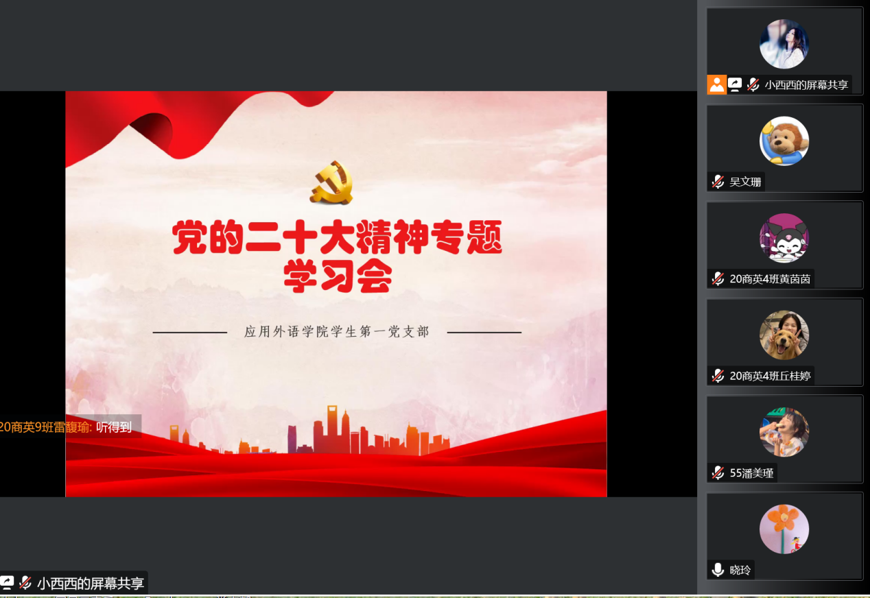 为深入学习贯彻党的二十大精神,114日晚,应用外语学院学生第一党支部召开党的二十大精神专题学习会,支部全体党员参加学习,会议由支部书记陈晓玲主持。