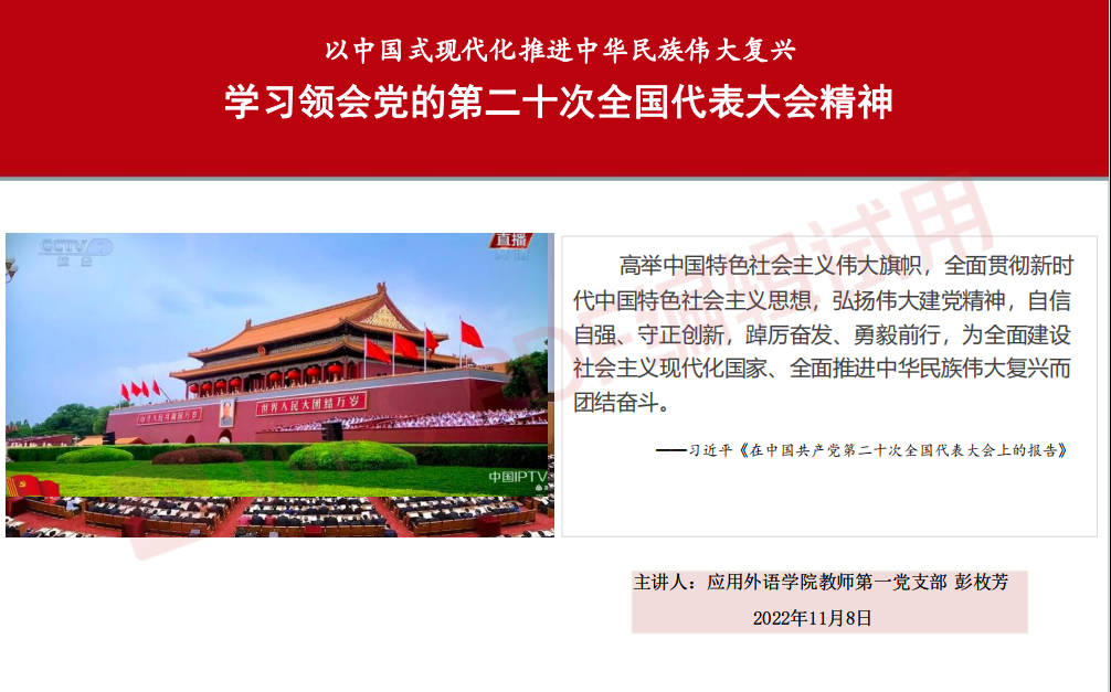 为全面贯彻习近平新时代中国特色社会主义思想,认真学习贯彻落实党的二十大精神,应用外语学院教师第二党支部在11月8日下午组织党的二十大精神专题学习。由于广州疫情的原因,本次专题学习采用线上腾讯会议集中学习的形式,支部全体党员教师参加。