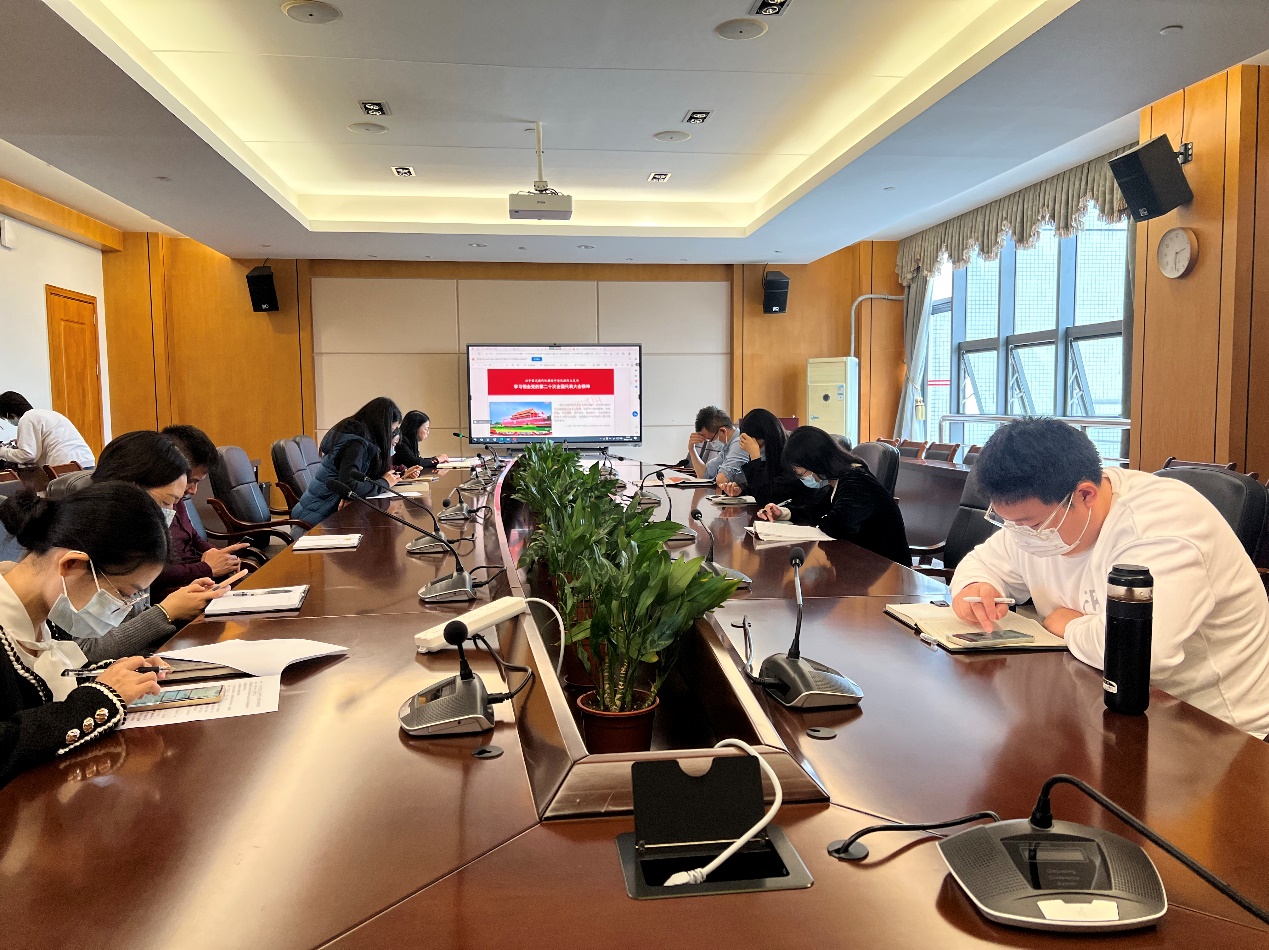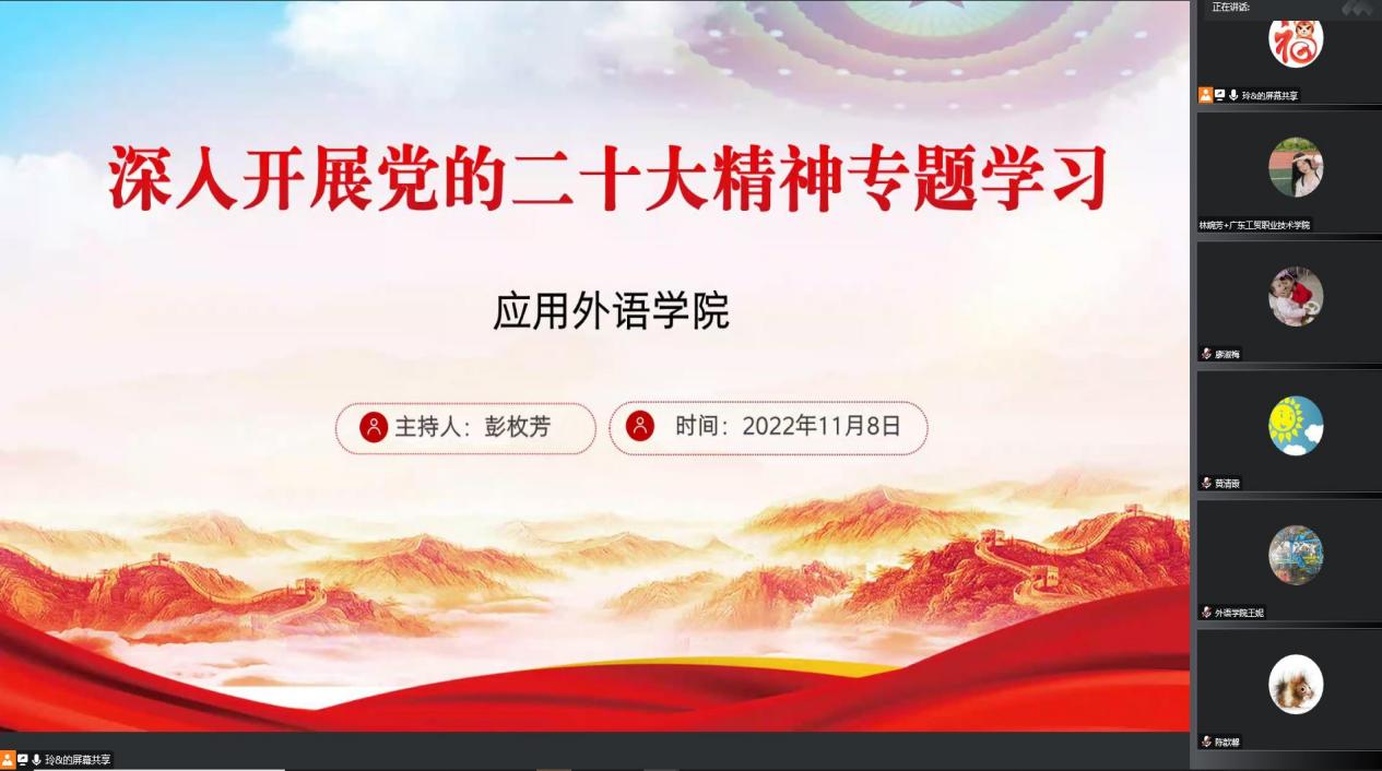 为全面贯彻习近平新时代中国特色社会主义思想,深入学习贯彻党的二十大精神,根据学校党委有关工作部署,11月8日下午,应用外语学院采用线上线下相结合的方式,同步召开第三期“深入开展党的二十大精神专题学习”会议。本次会议由应用外语学院院长彭枚芳主持,全体教职工参与。
