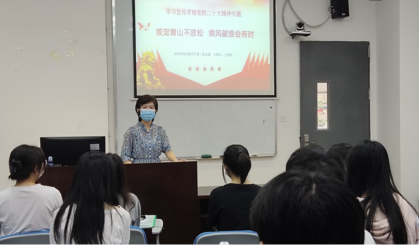 为更好地解读党的二十大精神,11月21日上午,应用外语学院学生第二党支部于明德楼1-215举行了党的二十大精神学习宣讲,支部书记王燕玲以“咬定青山不放松,乘风破浪会有时”为主题,带领支部党员、入党积极分子共同学习,深入阐释党的二十大精神。