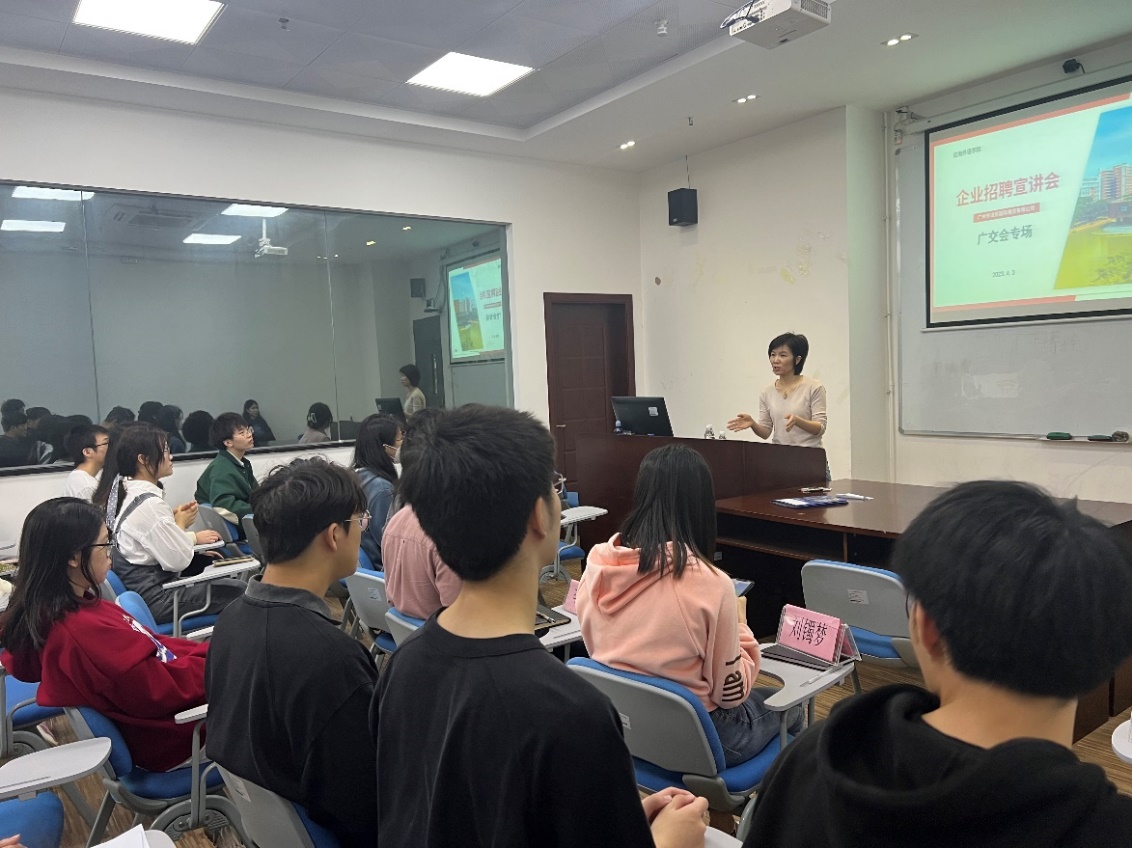根据教育部办公厅关于开展2023届高校毕业生春季促就业攻坚行动的通知要求,应用外语学院坚持早谋划、早部署、早行动,抢抓工作关键期,积极开展访企拓岗专项行动。4月3日下午,应用外语学院邀请广州市谊百国际展览有限公司在明德楼2-203开展访企拓岗交流会。学院辅导员老师王燕玲、李迪、雷雨濛、刘镯梦,及部分20级毕业班同学参加了此次活动。