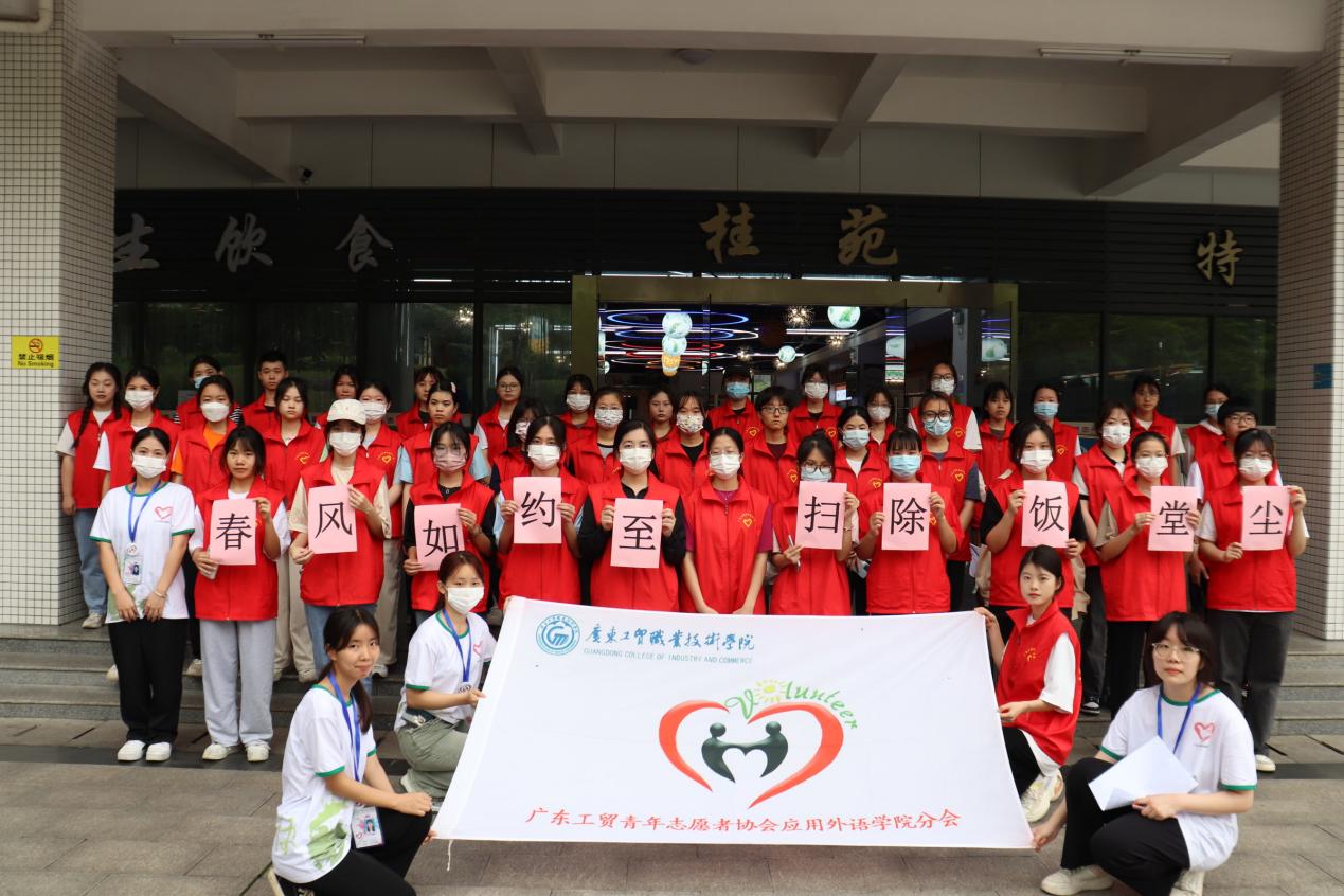 为深入贯彻落实习近平总书记系列重要讲话精神,全面贯彻党的教育方针,落实中共中央、国务院《关于全面加强新时代大中小学劳动教育的意见》全面落实立德树人根本任务,培养德智体美劳全面发展的社会主义建设者和接班人,响应学校环保月活动,培育劳动实践的成果, 4月22日下午3点应用外语学院青协分会组织志愿者开展以“春风如约至,扫除饭堂尘”为主题的义扫活动。